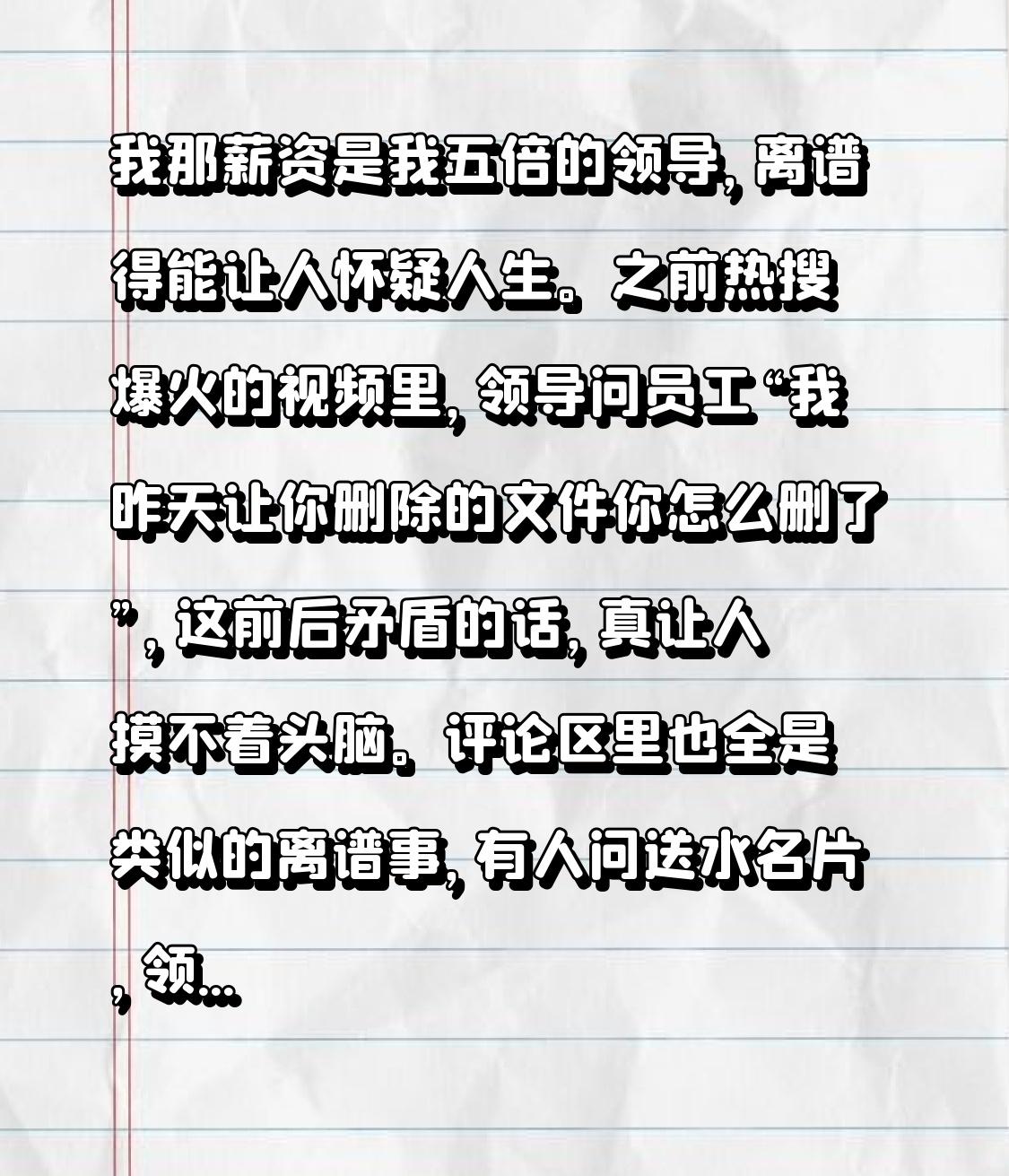 我那薪资是我五倍的领导,离谱得能让人怀疑人生。之前热搜爆火的视频里,领导问员工“我昨天让你删除的文件你怎么删了”,这前后矛盾的话,真让人摸不着头脑。评论区里也全是类似的离谱事,有人问送水名片,领导回复“喝就行”,员工发个表情包还被说不务正业;会议时间确认好,领导却能临时改变意思。 而且领导工资是员工好几倍,很多企业薪酬保密,就是因为做不到公平公正。领导拿着高薪,做事却没逻辑,这巨大的反差,真让人觉得职场太魔幻了。 职场人工资 对同事的评价