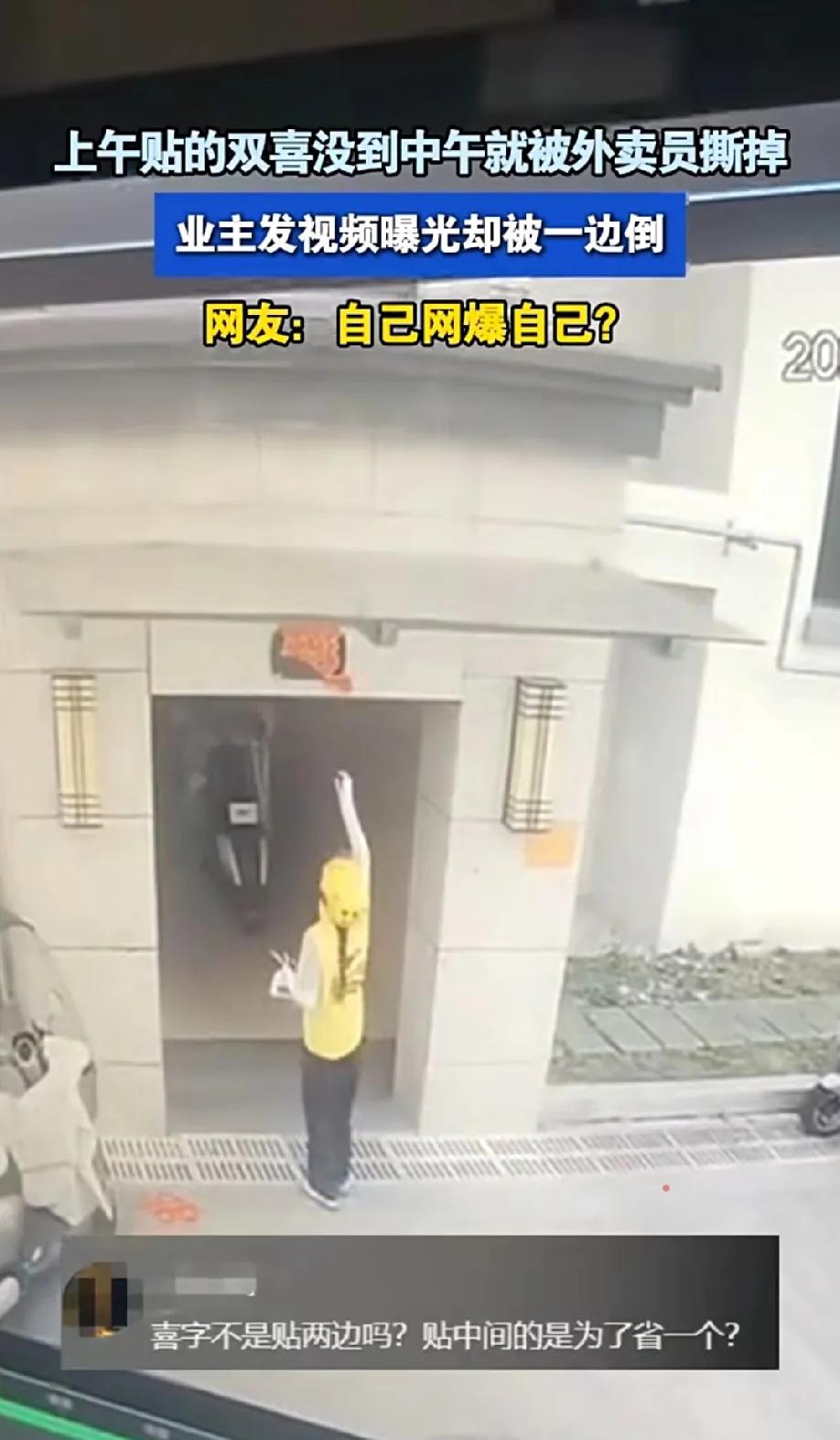 一业主上午贴的双喜没想到中午就被外卖员撕掉,业主发视频曝光,网友一致说是业主的错