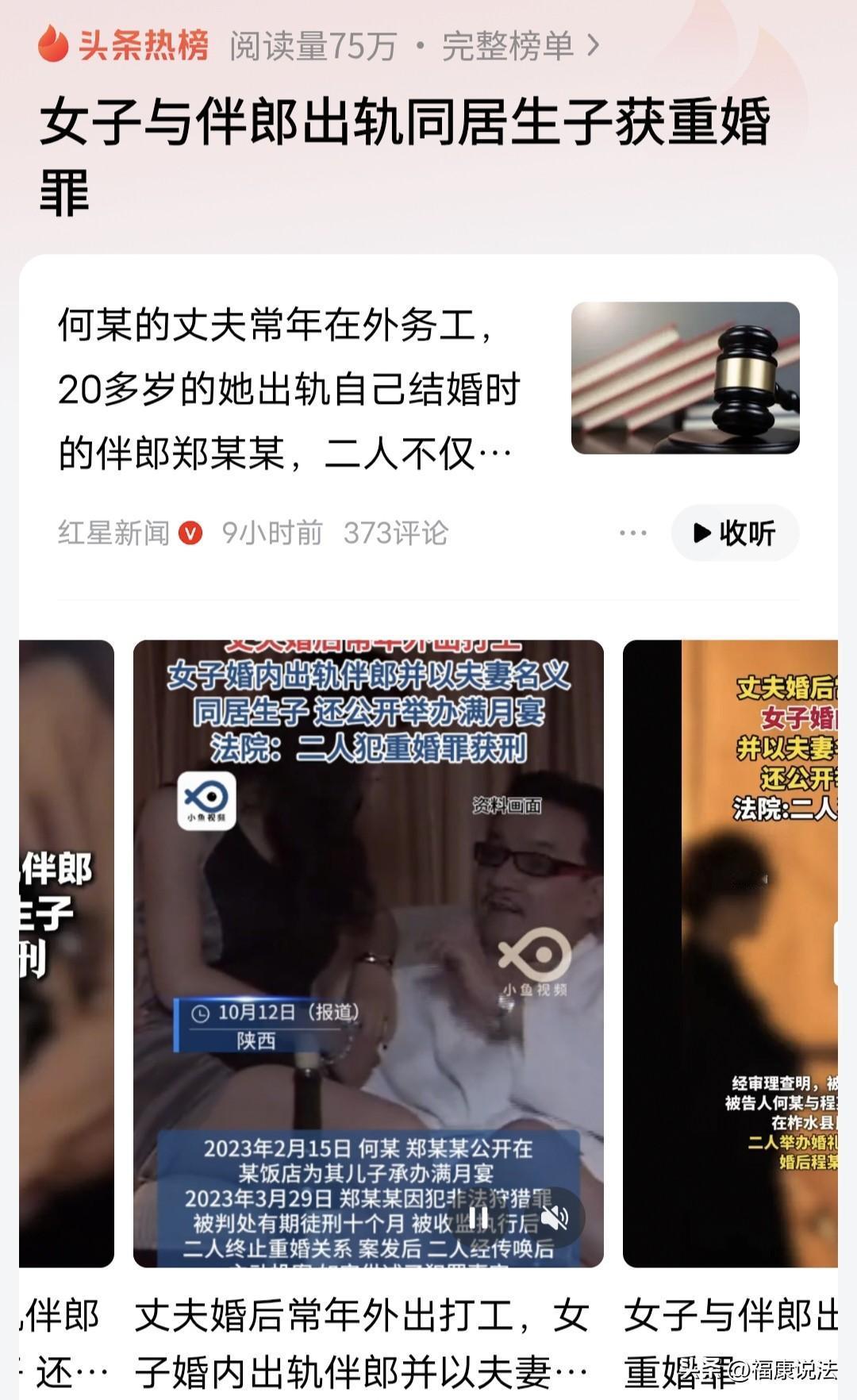 陕西柞水,20多岁女子婚后,丈夫外出打工,她偷偷和结婚时的伴郎以夫妻名义一起生活,2年后,女子和伴郎生下一男孩,之后,两人还给孩子办了满月宴,没想到,伴郎因非法狩猎罪被判有期徒刑10个月,这下两人露馅了,犯了重婚罪,法院对二人的判决令人意外。 2019年12月19日,20多岁何女士和程某登记结婚,正式结为夫妻。 婚礼办的热热闹闹,而未婚的郑某某作为伴郎也见证了二人的誓言,谁也没想到,郑某某却成为了这段婚姻的破坏者。 婚后,程某为了养家一人外出打工,然而,何女士在家本该照顾好家庭,可她却不安分守己和伴郎郑某某逐渐暧昧直至越界。 2020年,何女士干脆和郑某某住在一起了,两人像夫妻一般过上了幸福的小日子,甚至以夫妻名义对外。 而程某在在打工对此一无所知,家里的妻子和伴郎的事情,他也被蒙在鼓里。 可家里这边,何女士和郑某某感情越来越好,还怀了孕,她在2022年12月4号生下了一个男孩,可把郑某某高兴坏了。 何女士生孩子的时候,郑某某一直在医院以“丈夫”的身份陪着她,在签署委托书和患者知情同意书时他也是以夫妻身份签字的。 一转眼,两人一起抚养着孩子,看着他一天天长大,2023年2月15日,何女士和郑某某为了儿子,在一饭店大张旗鼓的办了一场满月宴。 这场满月宴很热闹,何女士家的亲戚都来参加了,而让她开心的是郑某某的父亲也来了。 然而,外人不知道内情的,都以为何女士和郑某某以及孩子是一家三口呢。 从此之后,何女士带着儿子生活,郑某某一直负责给她和孩子生活费,保障她们的生活。 不过好景不长,2023年3月29号,郑某某犯了非法狩猎罪,被判处有期徒刑10个月。 郑某某进去了,何女士和他的重婚关系也就暂时断了。 案发后,何女士、郑某某经传唤后主动投案,对犯罪事实供认不讳。 有人说,伴郎明知她是有夫之妇,却还明目张胆以夫妻名义同居并生子,更让人不解的是双方家长不但不制止,反而还公开参加满月宴,真的是太奇葩的家庭了。 现在有些人没有羞耻感,公然去做一些违背公序良俗的事情,不以为耻,反以为荣,是道德的缺失和婚姻的悲哀! 法院经过审理认为,何女士已与程某登记结婚,在婚姻存续期间与郑某某以夫妻名义共同生活。 何女士生孩子时,郑某某以丈夫身份签署配偶委托书、举办满月宴等。 郑某某明知何某有配偶仍参与其中,二人虽未再次登记结婚,但“以夫妻名义同居并生育子女”的行为符合事实重婚的认定标准。 通俗的说就是,通过公开的夫妻身份和共同生活形式,实质上破坏了一夫一妻制,因此构成重婚罪。 根据《刑法》第258条规定:有配偶而重婚的,或者明知他人有配偶而与之结婚的,处二年以下有期徒刑或者拘役。 因郑某某主动投案并认罪认罚,符合自首条件,依法可从轻处罚。 不过,郑某某此前因非法狩猎罪被判刑,有犯罪前科,表明其主观恶性较深、再犯风险较高,因此法院未对其适用缓刑,而是以重婚罪判处有期徒刑10个月。 对于何女士,法院又是怎么判定的呢? 本案中,何女士明明有丈夫,却和伴郎以夫妻名义共同生活,一方面违背公序良俗,另一方面犯了重婚罪。 如果说,何女士想与郑某某生活,她本可以先和丈夫离婚,而不是一边欺骗丈夫,一边和伴郎同居生子。 她这样做不仅伤害了丈夫程某,对于她与郑某某的孩子也是一种不负责任的行为。 不过,法院考虑到何某为初犯,且需抚养与郑某某所生的子女,社区矫正机构同意其接受社区矫正,法院认为适用缓刑不致危害社会。 何某与郑某某所生的子女年幼,需母亲直接抚养。若何某被收监执行实 刑,可能导致子女无人照料,引发新的社会问题。 最终,法院判决:何女士犯重婚罪,判处有期徒刑1年,缓刑2年。 而郑某某犯重婚罪,判处有期徒刑10个月。 假如,何女士的丈夫程某想离婚,他可以以何女士有重大过错为由,主张多分财产。 根据《民法典》第1087条规定:法院在分割夫妻共同财产时,会优先照顾无过错方的权益。 何某与郑的重婚行为属于重大过错,程某作为无过错方,可主张多分财产。 另外,何某的行为构成重婚罪,程某还可以主张精神损害赔偿。 这场闹剧是对婚姻忠诚的公然践踏,更是对法律底线的无视。女子婚内出轨伴郎,以夫妻名义同居生子还办满月宴,每一步都在挑战公序良俗。 法律最终的判刑,不仅是对两人违法行为的惩戒,更敲响警钟:婚姻从不是一纸空文,忠诚是义务,法律更是不可逾越的底线,任何违背夫妻忠实义务的人,终将付出惨痛代价。 关注@福康说法 从日常点滴学法律,生活安稳更有底