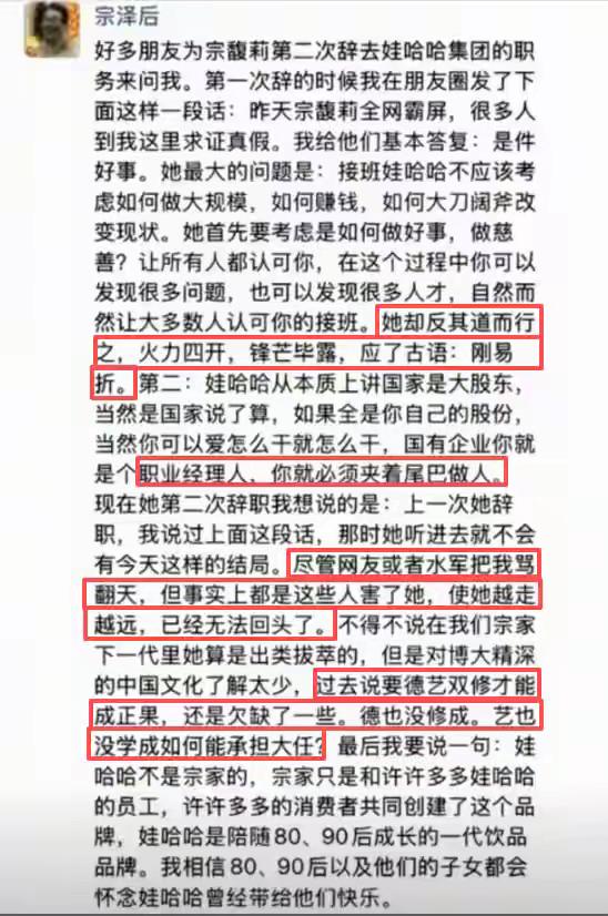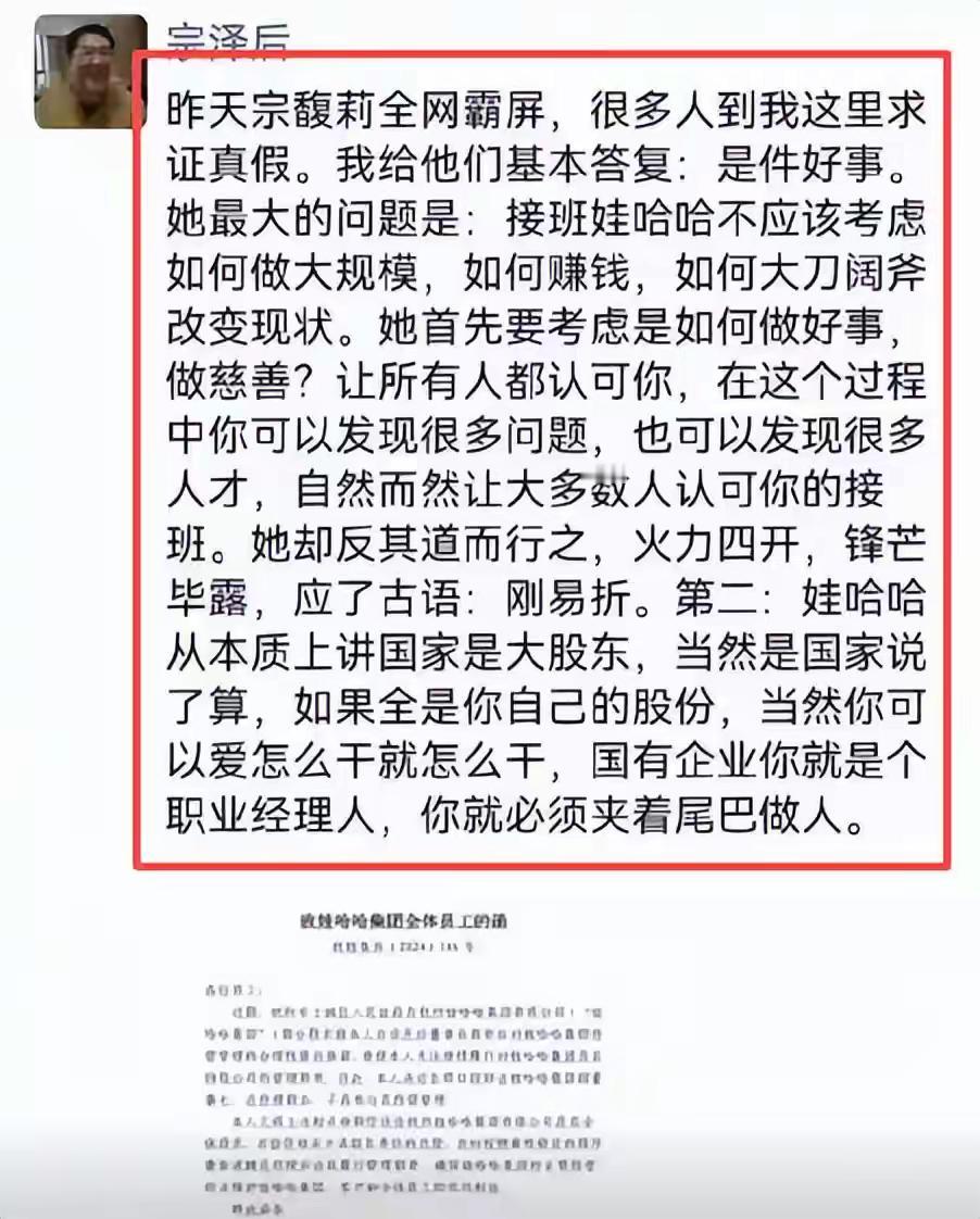 宗泽后还是有他哥哥的影子,说的尽是大实话,像个大男人的思维逻辑。 宗泽后认为小宗女做事太激进,接手娃哈哈不要先考虑多出成绩,多赚钱,而是多做好事,多照顾弟妹,多做慈善,拉拢住各方,支持你的人就多了。叔叔说的没毛病,娃哈哈又不是纯私营企业,想怎么弄就怎么弄行不通,就得夹着尾巴做人。 让我要是接了老爷子的班,才不管具体经营,有职业经理人,先舍得花钱,各方打点住,大家都高兴,有支持的一帮人再说下一步,激进改革,下面人得不到好处,用不多久钢刀就卷刃了。