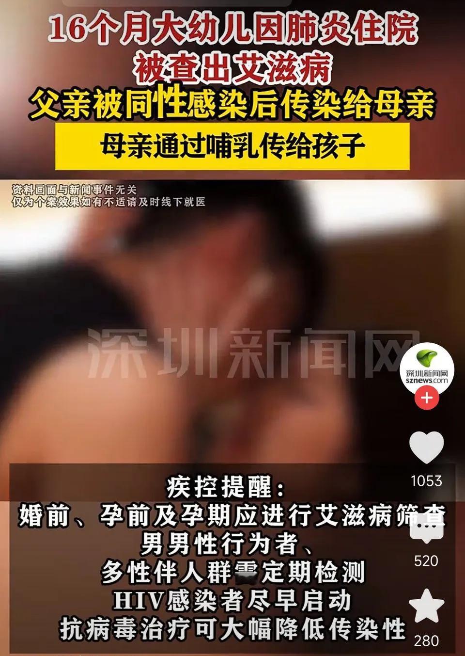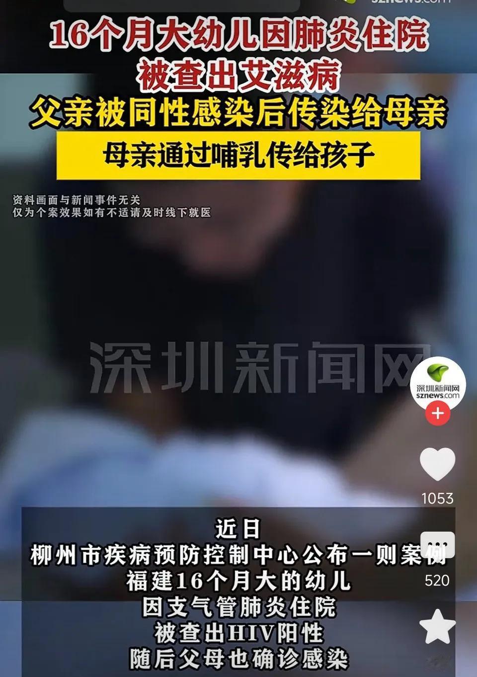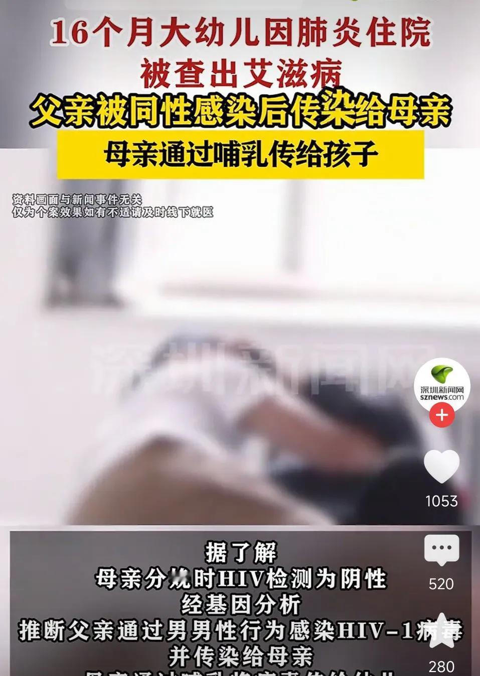 福建16个月大的幼儿因支气管肺炎住院,竟查出艾滋病! 母亲分娩时HIV检测为阴性。经基因分析,推断父亲通过男男性行为感染HIV-1病毒,并传染给母亲。 母亲通过哺乳将病毒传给幼儿。HIV存在于HIV阳性母亲的乳汁中! 在喂养过程中,病毒可以通过婴儿口腔、咽喉或消化道中可能存在的微小破损或黏膜,进入婴儿体内,然后导致感染! 可怜了孩子,才一岁就得了艾滋病! 这对母子以后该怎么生活?被渣男祸害了,尤其是孩子,才一岁多! 不歧视同性恋,但请管好自己,不要祸害他人! 如果不是这孩子的爸爸出轨同性,就不会导致一家全感染艾滋病!太可恨了!