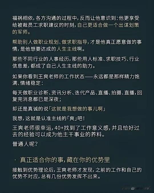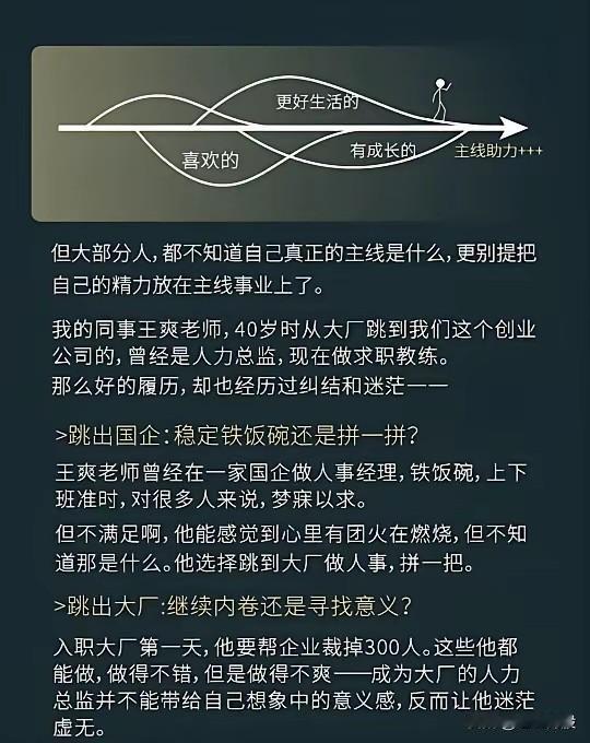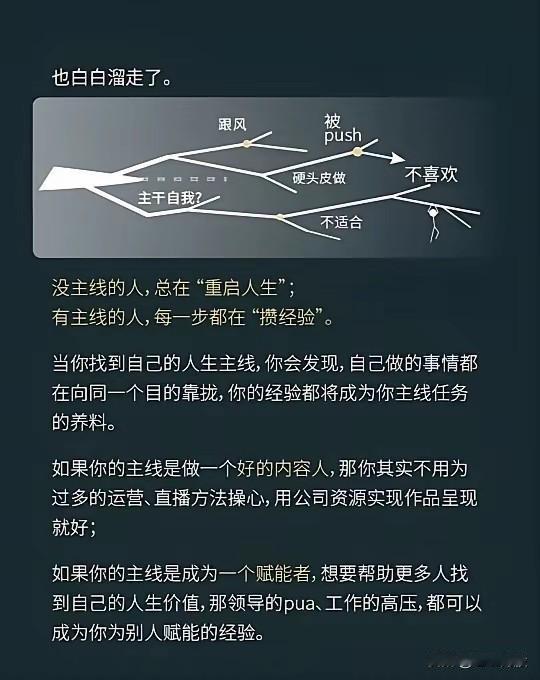 找到你的人生主线任务,是回报率最高的一件事,没有之一。 一、什么是“人生主线任务”? “主线任务”是指你内心真正认同、擅长、有热情去做,并能持续积累经验和价值的事情。它不是盲目跟随社会期待、他人安排或者短期风口,而是与你的优势、兴趣和长期目标一致的方向。 二、为什么找到主线如此重要? 1. 没有主线的人,总在“重启人生” 2. 有主线的人,每一步都在“攒经验” 三、如何找到你的人生主线? 1. 回顾经历,寻找“心流”与意义感 2. 你的优势,藏着你的主线 3. 通过科学方法,定位你的优势 总结一句话: 找到你真正热爱、擅长,并能持续积累价值的人生主线任务,是你这一生回报率最高的投资。它不仅能让你摆脱迷茫与内耗,还能让你在每一个当下,都活得充实而有意义。