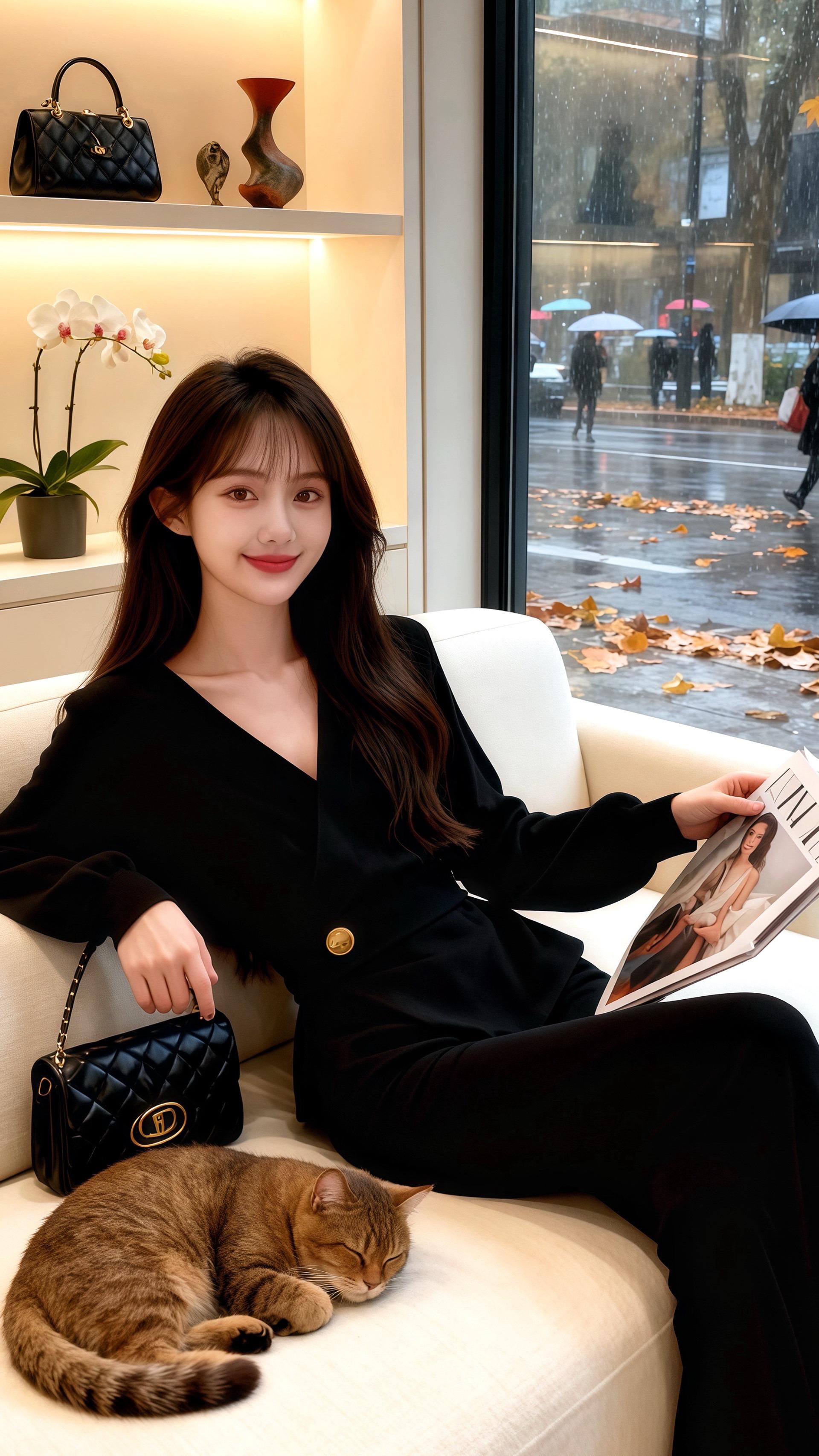 秋雨淅沥,许妍抱着猫站在服装店落地窗前,一身黑色套装衬得她优雅又灵动。...
