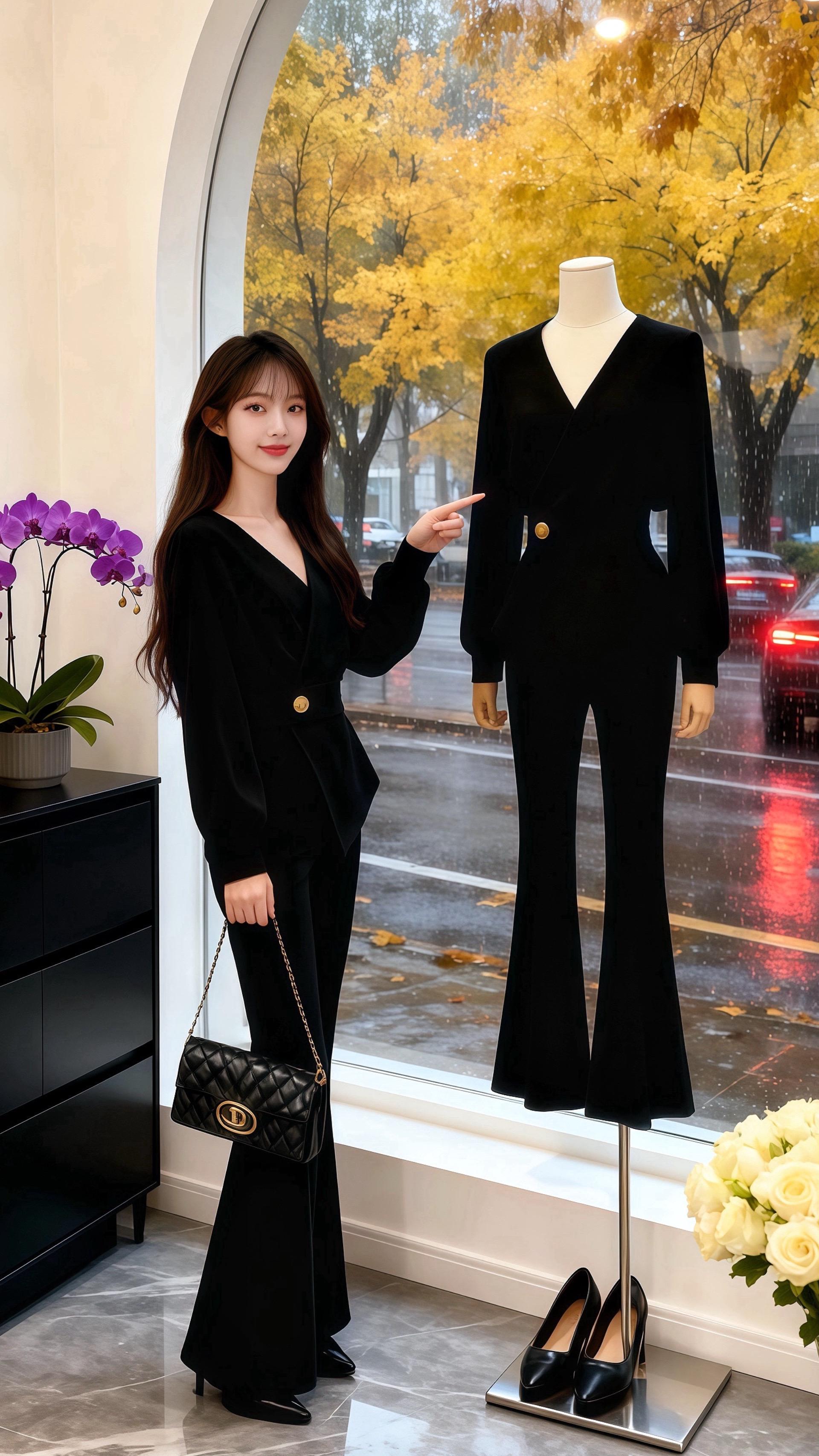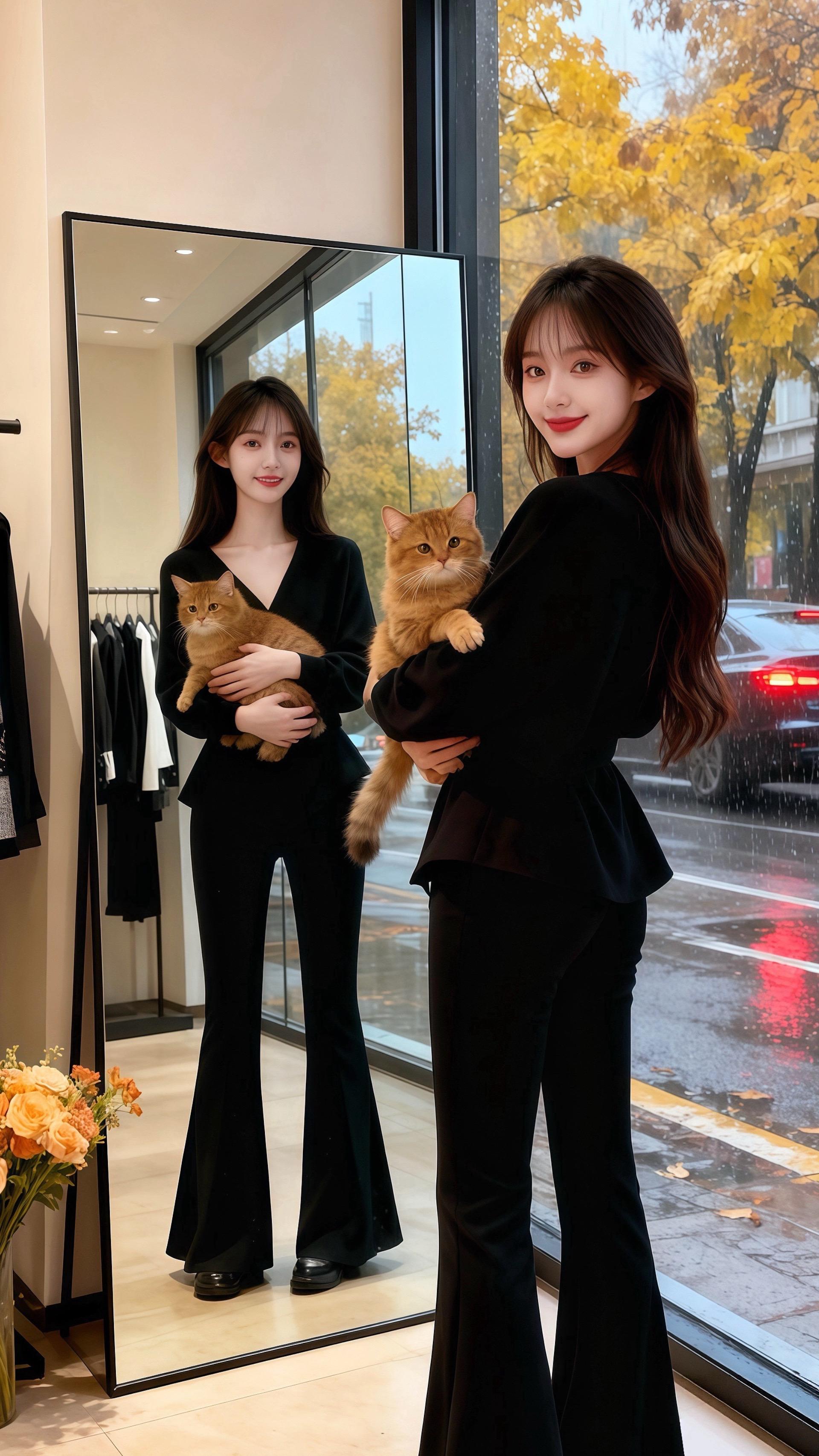 秋雨淅沥,许妍抱着猫站在服装店落地窗前,一身黑色套装衬得她优雅又灵动。皓明推门进来,目光瞬间被她锁住:“你这身穿搭,把气质衬得好特别。”