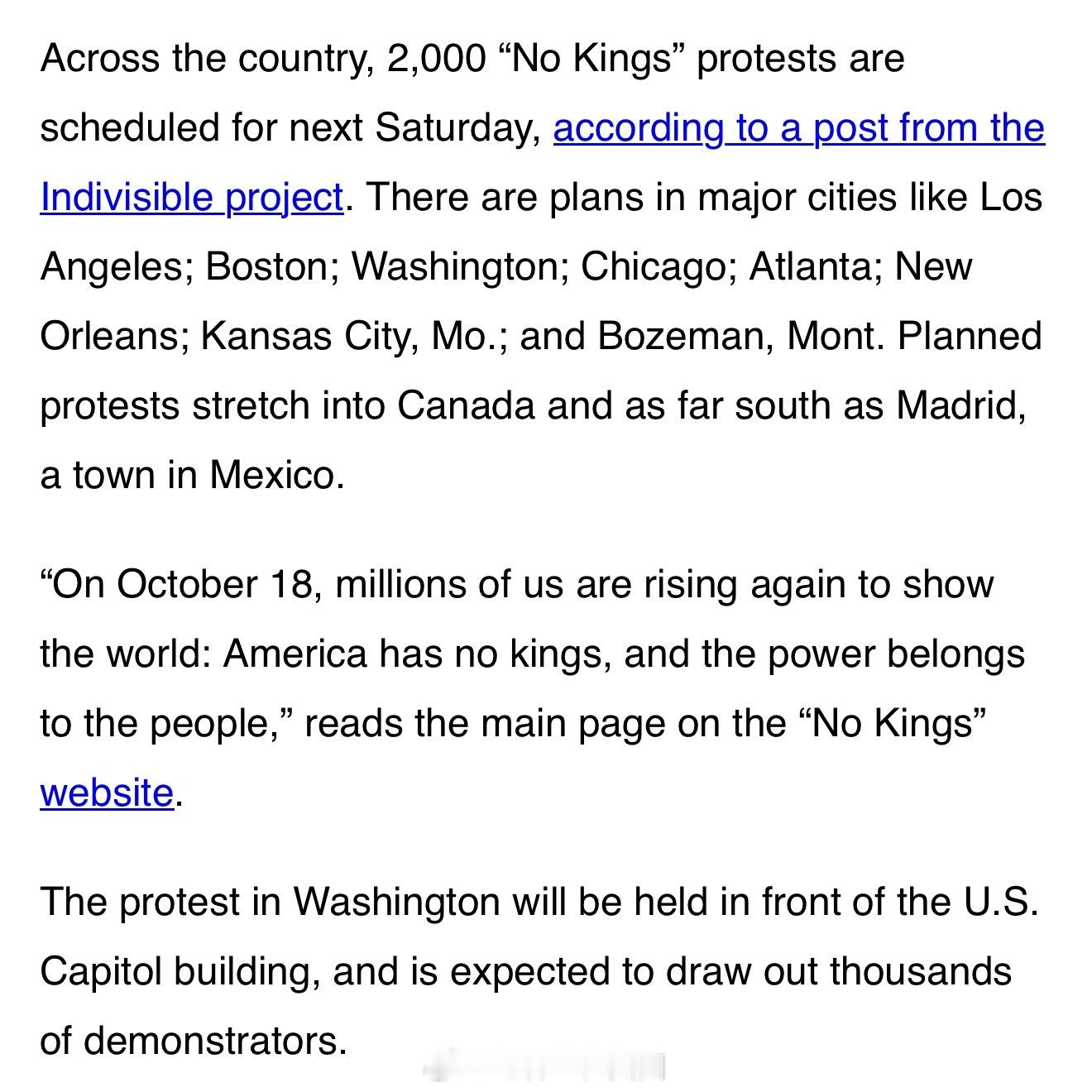 “No Kings”全美全国性抗议活动将于10月18日举行,预计将有2000场抗议活动,包括洛杉矶、波士顿、华盛顿、芝加哥、亚特兰大、新奥尔良等主要城市都在筹划之中。