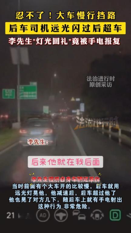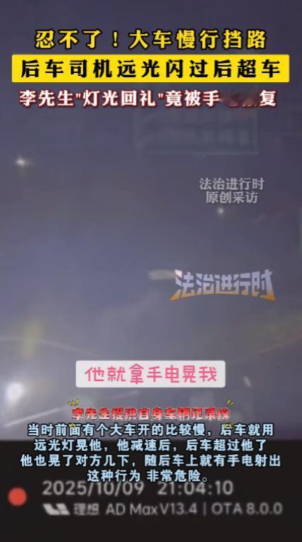 “冤不冤?”10 月 9 日,北京,一男子开车行驶在辅路上,由于前方大车速度较慢。 男子姓陈,是家软件公司的测试工程师,刚结束加班,晚上 8 点多从大兴区往丰台区赶,走的是京开辅路天宫院路段,这段路一侧是在建的商品房工地,另一侧停着不少共享电动车,车道只有一股,特别窄。 前方的大车是辆蓝色的轻型货车,车身上印着 “市政建材运输” 的白色字样,后斗里装着半车水泥管,开得特别稳,仪表盘显示时速只有 28 公里,陈先生的白色轿车跟在后面,想超却没地方变道,只能轻轻踩着刹车,保持安全距离。 没走三分钟,后车的远光灯就亮了,透过车内后视镜,强光晃得陈先生眼睛发花,连后视镜里后车的轮廓都看不清,他以为后车司机是不小心碰到灯光开关,没在意,可那远光一直亮着,还时不时闪两下,像是在催促。 陈先生从侧后视镜瞅了一眼,后车是辆黑色的紧凑型 SUV,车头贴了个卡通小熊贴纸,车轮毂上还挂着红色的装饰带,那车跟得特别近,保险杠几乎要贴到陈先生的车尾,他心里有点发紧,生怕对方追尾。 又往前开了大概 500 米,前面到了一个临时开口,能借道旁边的非机动车道短暂超车,陈先生赶紧打了右转向灯,把车速降到 20 公里 / 小时,还轻轻按了两下喇叭,示意后车可以超车,后车司机好像看懂了,打了左转向灯,加速从旁边超了过去。 陈先生见对方超了车,心里松了口气,想着总算不用被远光晃了,可能是加班累得有点恍惚,也可能是下意识的反应,他顺手打开远光晃了两下,想提醒对方 “刚才你晃我半天,我这也算提个醒”,可这两下却捅了 “马蜂窝”。 那辆 SUV 超过去后,并没有加速离开,反而在前面慢了下来,副驾驶的车窗 “唰” 地降下来,一只手伸出来,手里攥着个黑色的强光手电,对着陈先生的车直射过来,那光比远光灯还刺眼,陈先生瞬间眼前一片白,赶紧踩刹车,车轮差点蹭到路边的路缘石。 他赶紧关掉远光,还打开双闪,对着前方摆手,意思是 “别照了,我不是故意的”,可对方根本不搭理,手电光来回晃,陈先生只能眯着眼,一点点往前挪,直到过了那个临时开口,SUV 才加速开走,临走前还又照了他一下。 陈先生到了家,后背还在冒冷汗,他把这事发在了小区的车友群里,群里的张哥说 “我上礼拜在五环也遇到过,被手电照得差点撞护栏,后来我报了警,交警说这种行为算妨碍安全驾驶,罚了对方 200 块”。 他还查了《道路交通安全法实施条例》,里面第 48 条明确规定,夜间会车应当在距相对方向来车 150 米以外改用近光灯,禁止使用远光灯或强光照射,北京交管局 2025 年 6 月刚发的《夜间行车文明指引》里,还专门提到 “灯光斗气” 容易引发事故,建议遇到这种情况先避让再记录证据。 你要是晚上开车遇到别人一直用远光晃你,或者像陈先生这样被手电照,会选择先忍一忍,还是停下来拍视频留证据报警呀? 信源:法治进行时 2025-10-10《北京京开辅路 “灯光斗气” 事件:男子让超后遭强光手电照射》