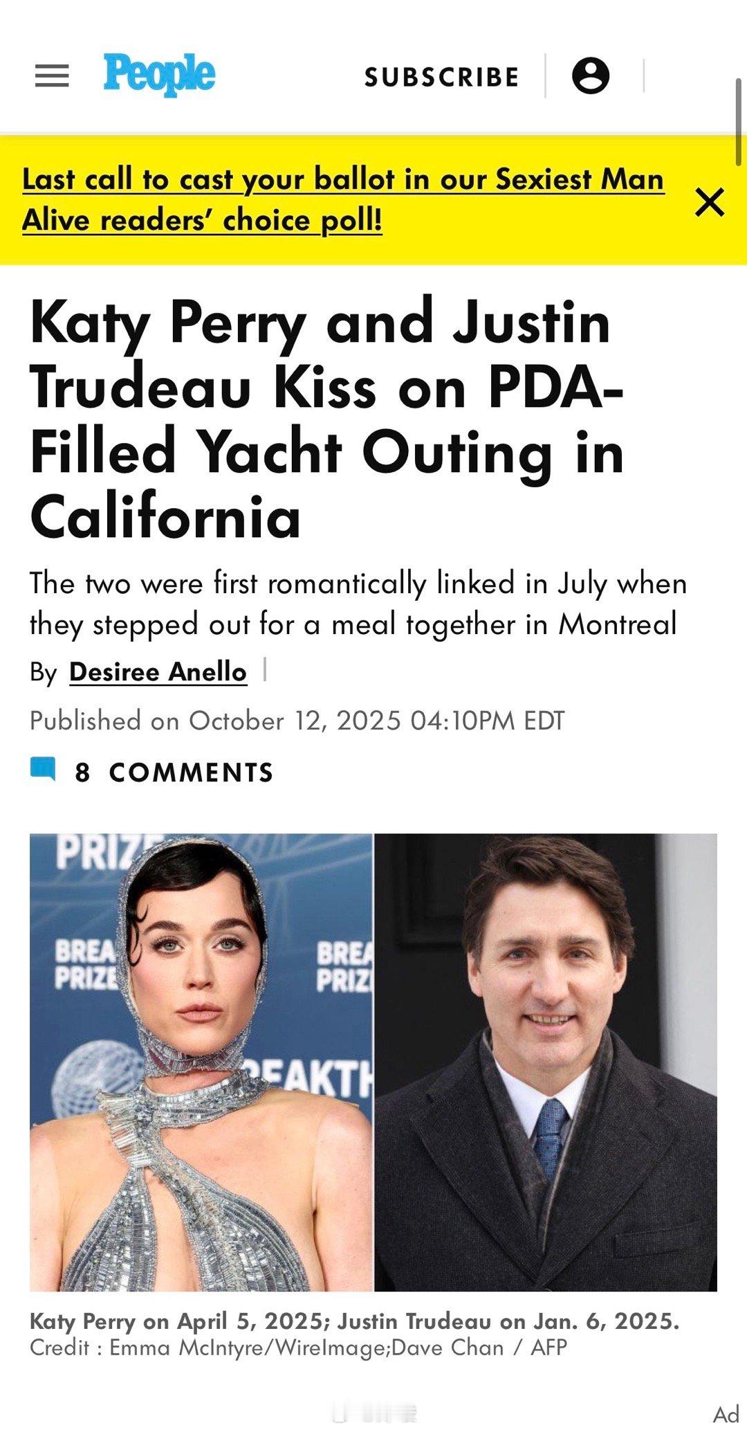 40岁的Katy Perry和53岁的Trudeau是今年7月一起吃饭传出绯闻的。小土豆还参加了水果姐的蒙特利尔演唱会。