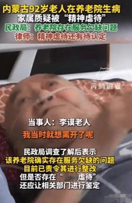 8200元/月养老院竟如此“敬老”!92岁老人喊60次救命无人应,监控画面让女儿崩溃 “爸,这8200块一月的养老院,肯定能把您照顾得好好的!” 李女士当初咬着牙选养老院时,满脑子都是父亲安享晚年的画面。这家位于市区核心地段的养老院,广告上“全天候看护”“一对一护理”的字眼,配上绿植环绕的环境,让她觉得再贵也值。 送92岁的老父亲李大爷入住那天,工作人员笑脸相迎,一口一个“您放心,我们比家人还用心”,更是让她放了心。可谁能想到,这竟是噩梦的开始。 刚住进去三四天,李大爷就突然垮了——高烧不退、呼吸困难,连话都说不完整。养老院一个电话打来,只说“老人年纪大,突发状况正常”,急得李女士直奔医院。 看着病床上奄奄一息的父亲,李女士怎么也不信“突发状况”的说辞。她反复要求看监控,几经周折才拿到录像,画面里的场景让她当场崩溃。 监控中,李大爷孤零零坐在走廊轮椅上,身体明显不舒服,想躺下却没力气。他抬起手朝着护理人员的方向,一遍又一遍喊“帮我一下”“我想躺下”,声音从清晰到微弱,最后带着哭腔,整整喊了60多次。 可旁边的工作人员呢?要么凑在一起聊天,要么低头刷手机,全程没人看老人一眼。整整三个小时,老人就那样僵在轮椅上,眼神里的无助快要溢出屏幕,直到没了力气,才有人慢悠悠走过去。 “我花着高价把父亲托付给你们,不是让他来受这份罪的!”李女士找到养老院讨说法,对方先是甩锅“护理员太忙”“老人不配合”,证据摆在面前才勉强承认“服务不足”,态度却冷漠得像没事人。 如今李大爷还在医院躺着,医生说因为长时间没人照料,加上年纪大,康复希望渺茫。李女士要求赔偿医疗费、公开道歉,养老院却只说“需要核实”,迟迟不解决。 这事曝光后,网友们炸了锅:“8200块啊!普通家庭半年积蓄,换来的竟是这种‘虐待’?”“养老机构监管到底在哪?别让‘安度晚年’变成‘花钱买罪受’!” 你身边有遇到过不靠谱的养老院吗?欢迎在评论区说说你的经历。