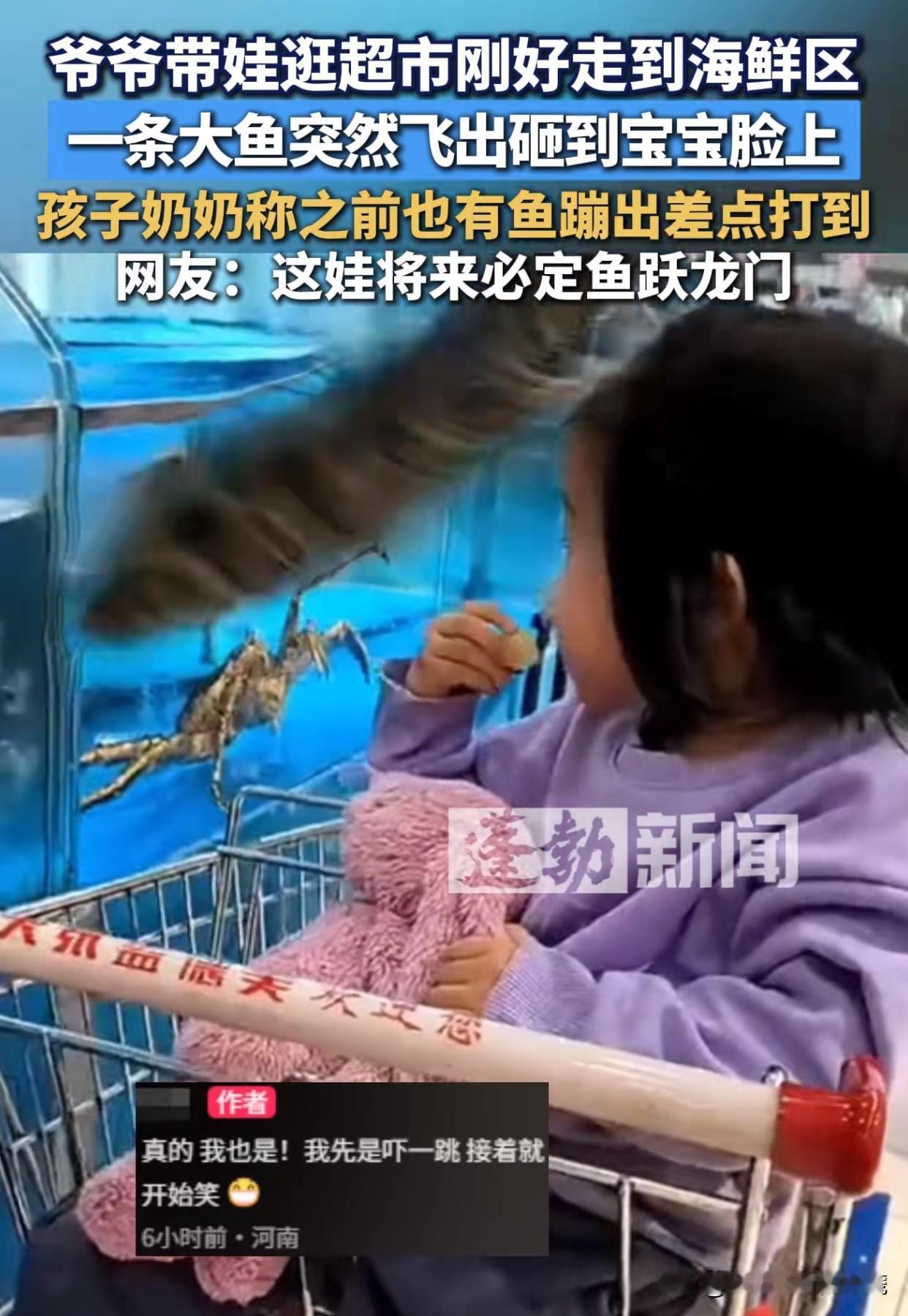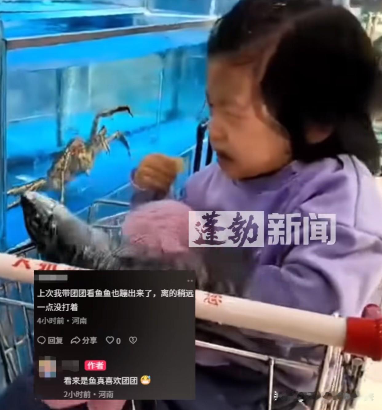 “感到又好笑又好气!”河南一家人带宝宝逛超市,小宝宝正看鱼呢,突然一条大黑鱼“啪