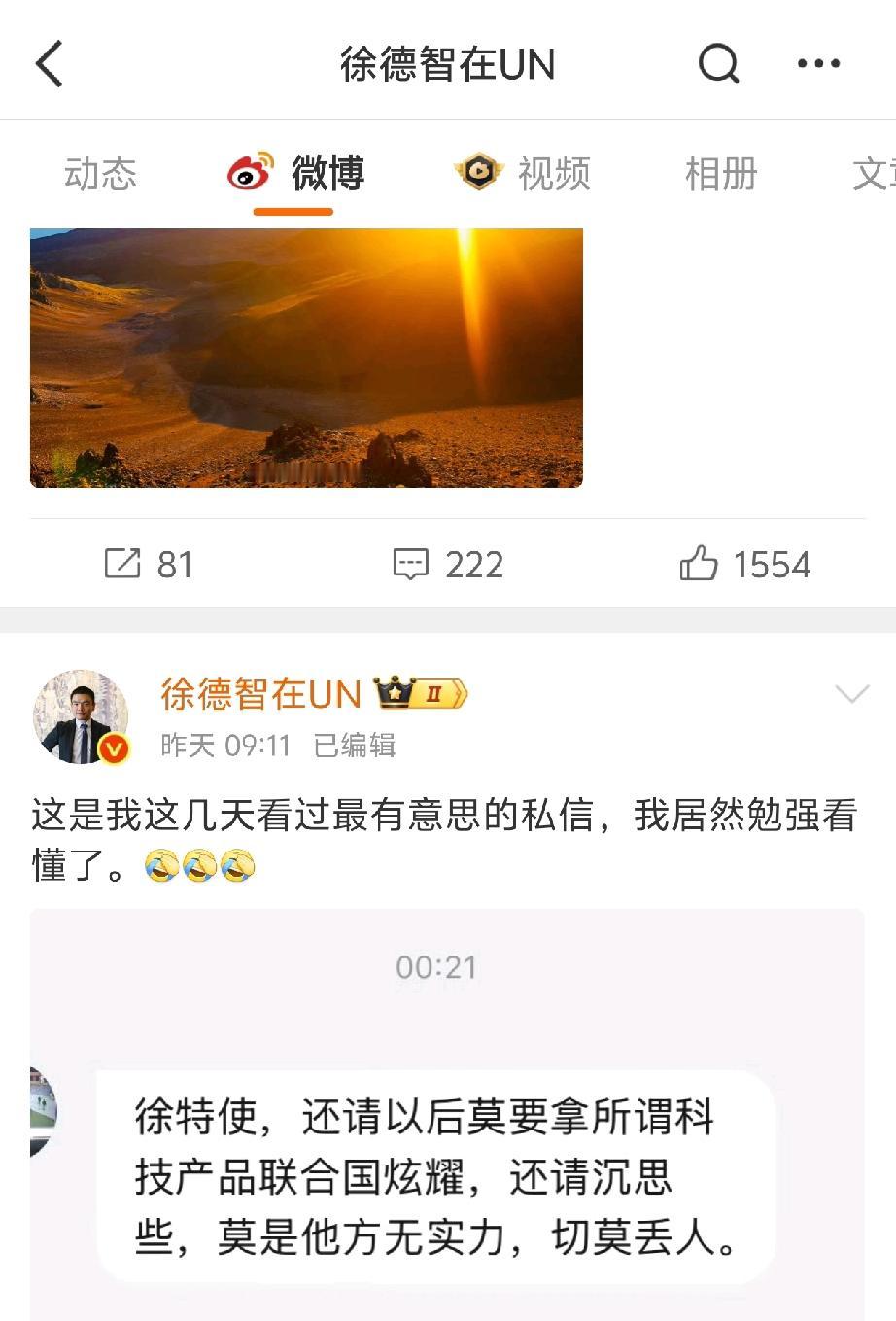 网上传疯了! 有高人指点吗? 好像是大殖子说的话?看了半天。咱也看不懂徐德智收到的私信是啥意思?就连他都懵逼了半天! 徐德智知道吗?就是在联合国被秘书长点名表扬的那位记者!他老是提问问题!老有名气了!