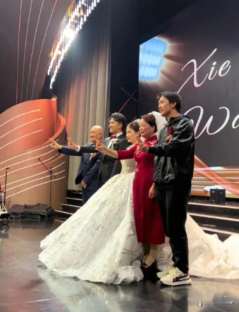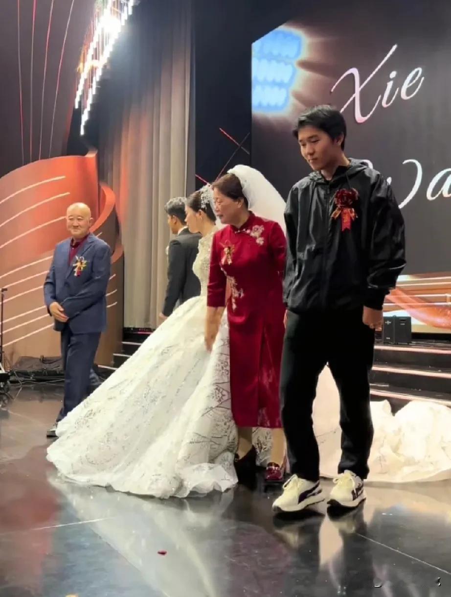 终于算是见到王心怡的爸爸妈妈笑的画面了, 不过,站在在王心怡妈妈身边的那个男生应该是王心怡的弟弟吧,他的个子好高啊, 这也是第一次看到王心怡的弟弟露脸, 但是看到很多网友都疑惑为什么让婆婆丈母娘弄个头纱感觉怪怪的 而且还是红衣服配白纱头饰[捂脸]
