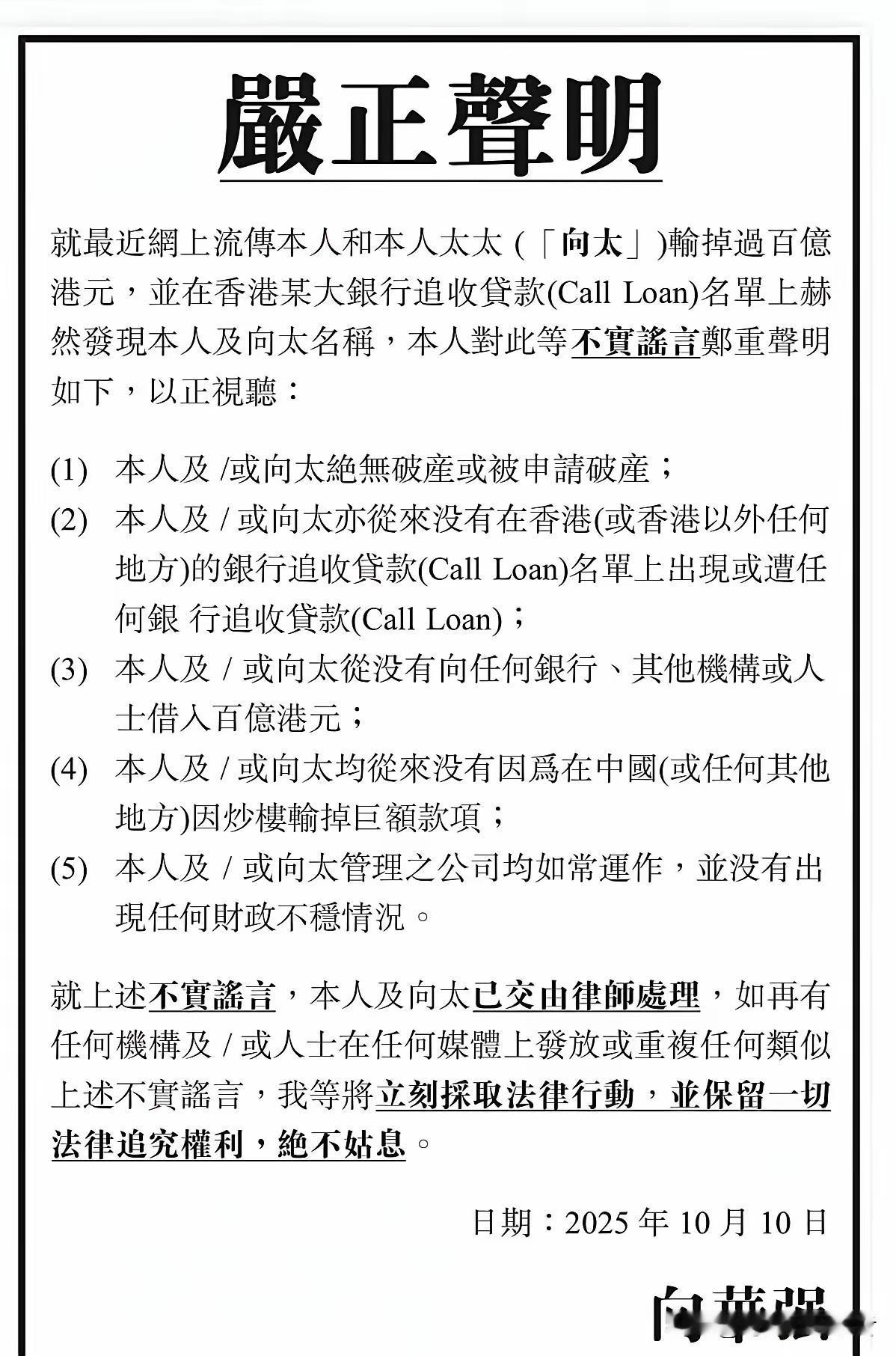 向华强真的太委屈了,自己和老婆打拼一辈子,老了儿子靠哗众取宠赚钱,自己老婆直播分享八卦,带货,被网友猜测财务危机。 向华强和向太回香港发声明,不欠钱,投资不失败,公司正常运行。