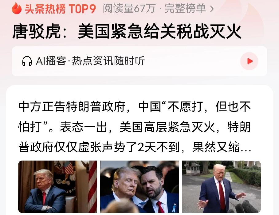 再现TACO?鹰酱一二把手,又双双嘴软了,悄悄收起了举起的关税“大棒” 一觉醒来,事关“关税战”,发生了一些意料之中的风景。 先说为什么是意料之中呢? 因为老特发出威胁后,龙哥掷地有声的说,“不愿打,也不怕打”。 这就是把架势拉开了,直接告诉他,想打奉陪到底。 面对这种情况,咋办? 再来一次TACO呗! 于是我们看到,鹰酱一把手说,不要担心龙国,一切的会好起来的,鹰酱只是想帮助而不是伤害龙哥。 与此同时,鹰酱二把手也说,我们需要理性看待龙哥,虽然我们有很多筹码,但,我们不准备用,老特特别重视与龙哥的关系…… 你瞅瞅,你瞅瞅,挥舞的关税“大棒”不见了,还拿了一颗糖。 这双双嘴软的背后啥? 亮剑,谋局,谋局,亮剑,显然老特没明白这四个字哪两个在前,哪两个在后。 鹰酱说“三板斧”亮剑,没下文,有也是再来“三板斧”,反观龙哥,先谋篇布局,再亮剑,组合拳下后手不断。 这种情况下,出现TACO也就不足为怪了,您说对吧?
