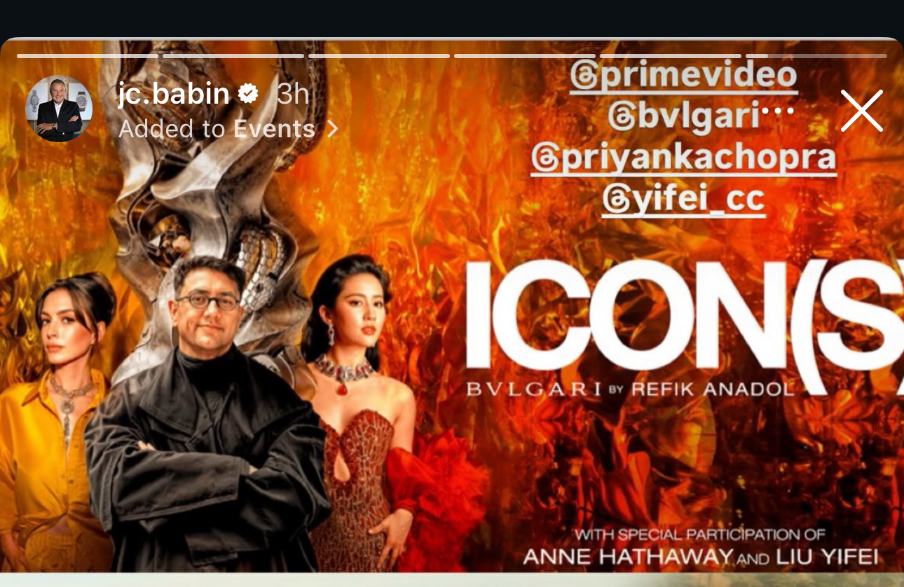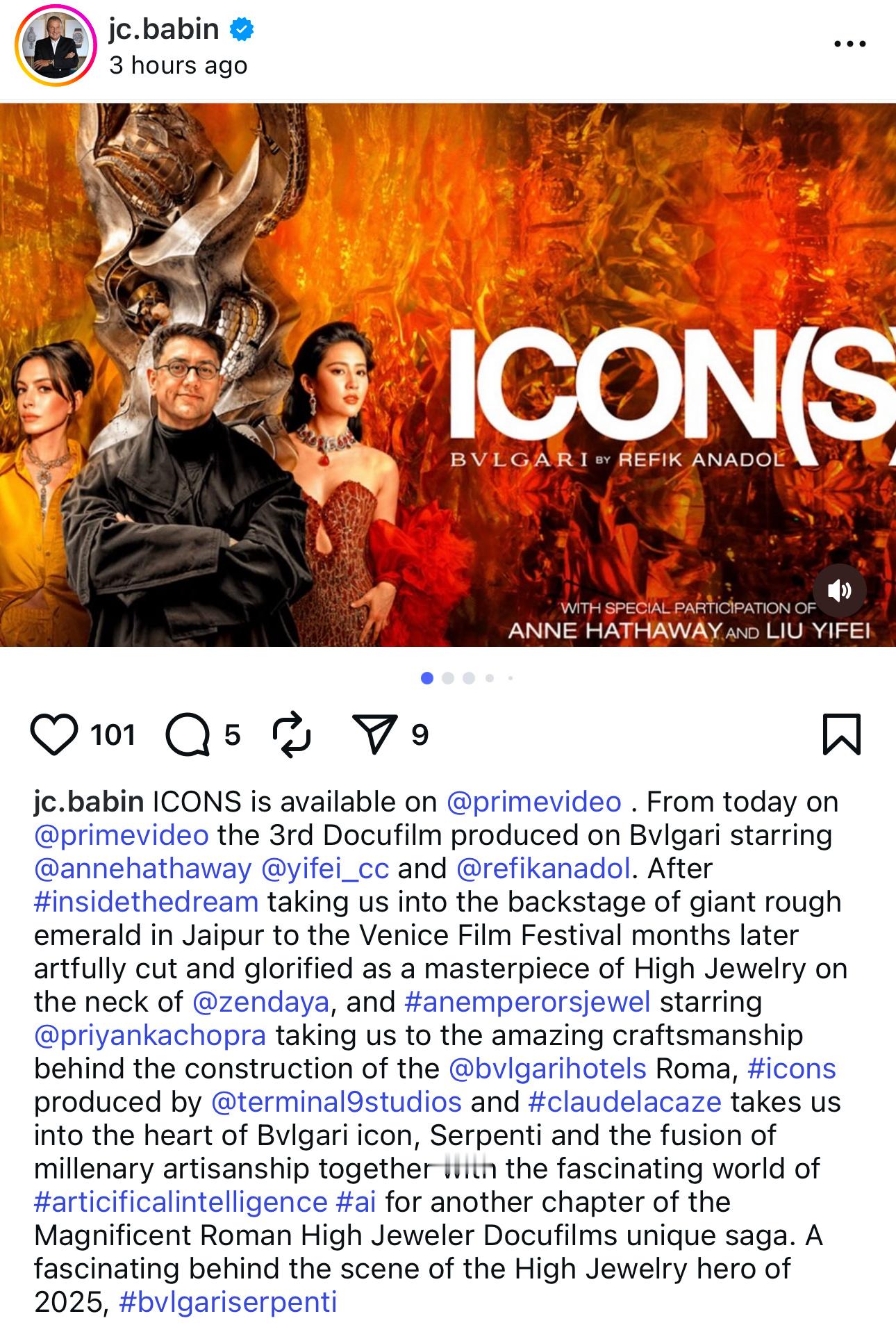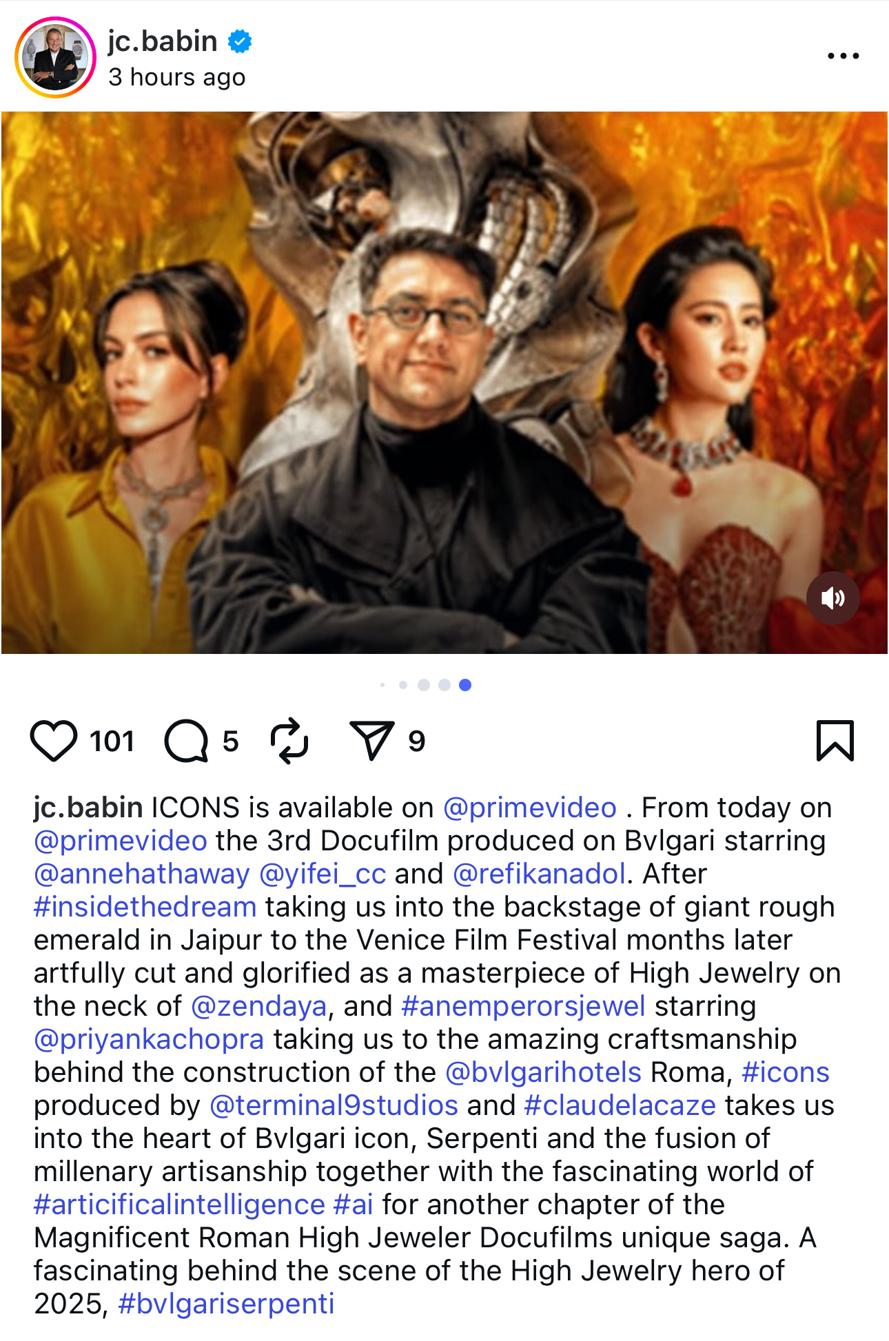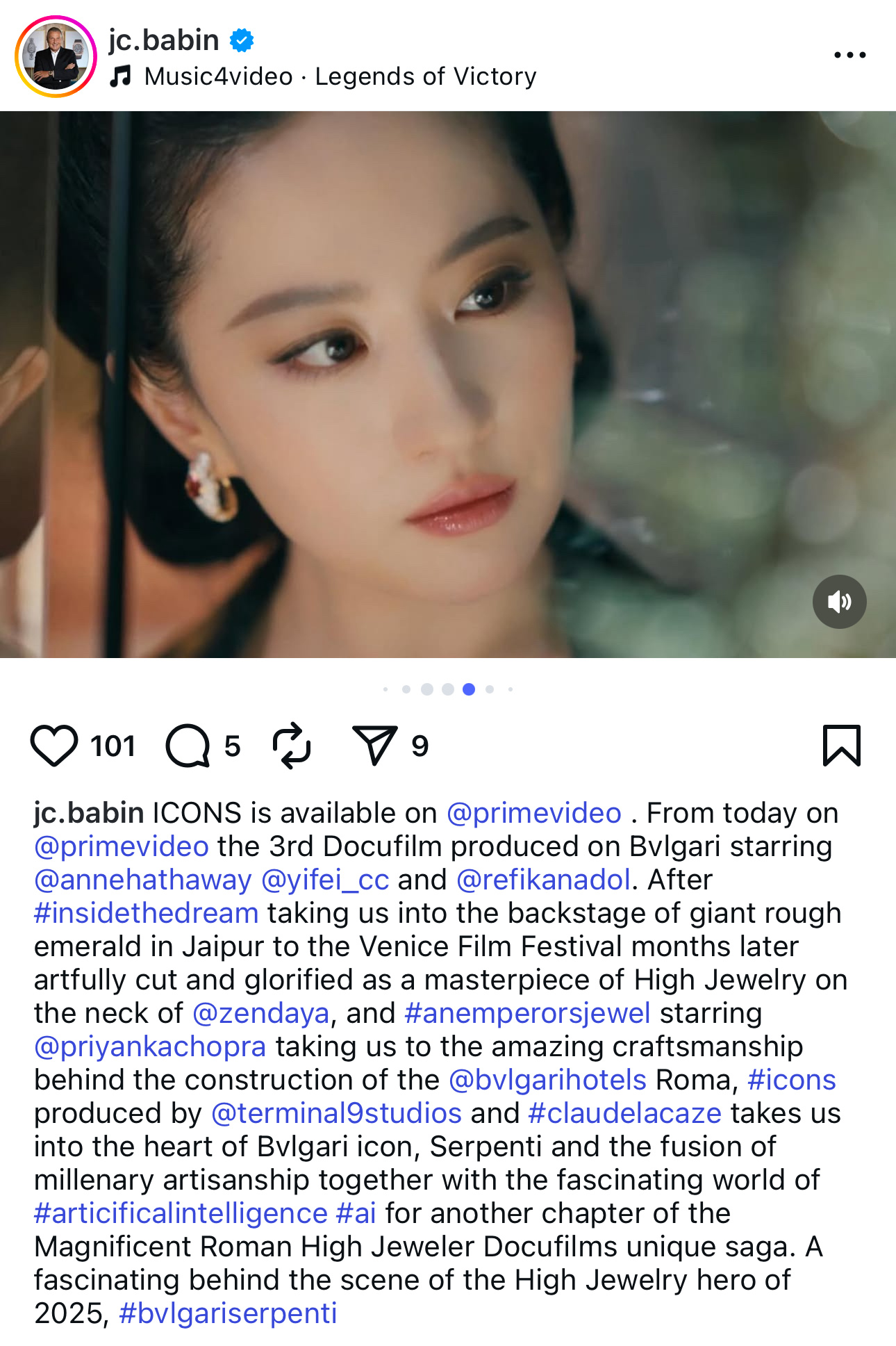 宝格丽总裁JC Babin在自己的官方Ins发布:由刘亦菲和Anne Hathaway主演的宝格丽第三部纪录片已经在Prime Video上线💎