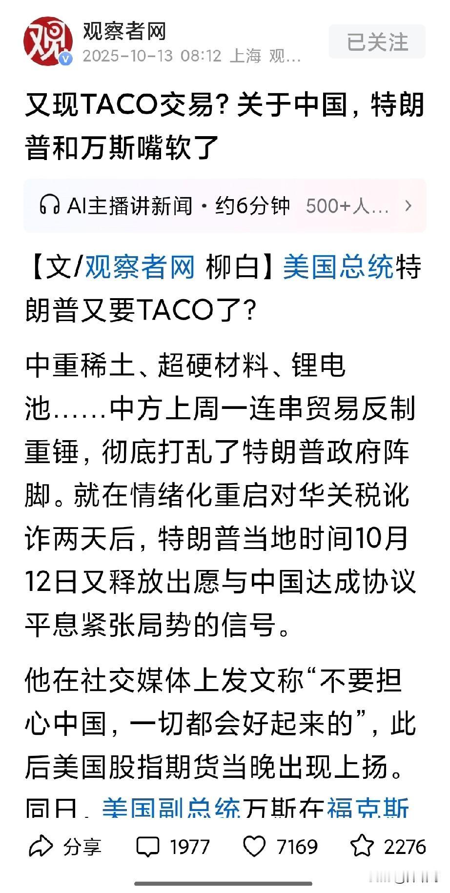 72小时不到美国高层就出现服软的迹象,特朗普与万斯先后在个人推特上表示要为中美这
