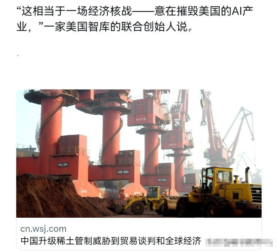 [微风]美媒声称,中国的管制政策不亚于对美国发起了一场经济核战!10月10日,在我们的稀土管制政策出台之后,美国《华尔街日报》立刻发文,将此形容成一次直击要害的“经济核战”,目标直指美国赖以发展的人工智能产业。 他们还猜测,中美很可能在韩国碰面,而这项政策就是在会谈前抛出的“筹码”,甚至不排除会视谈判情况来调整力度。 稀土在普通人眼里没什么存在感,但在现代工业特别是高科技领域,它几乎是不可替代的核心材料。 从高性能芯片,到新一代人工智能、无人系统,再到部分尖端军事设备,稀土都是关键一环。 而中国长期稳居全球稀土供应的绝对主导地位,这意味着一旦我们在出口上做文章,全球产业链都会迅速感受到震动。 这次的管制虽然细节没完全公开,但足以让美国的科技圈和工业界坐不住。 原因很直接,他们的AI和芯片产业习惯了稳定的稀土供应,一旦这个环节被卡住,后续的生产、研发都会受到影响。 这种焦虑,不仅在媒体报道里有体现,连相关企业和行业组织也开始紧盯事态发展。 美国舆论很快把这件事上升到战略层面,怀疑这是一次高度针对性的出招。 他们推测,中国是在韩美会谈前释放信号,以此增加谈判的筹码,并会根据局势来决定政策是否“全面生效”。 对于这些猜测,我们的立场很明确:稀土不仅是经济商品,它同时有军民两用的属性,一旦被用在不当的地方,有可能转化为高风险的军备能力。 加强出口管制,就是为了避免这种情况发生,从这个角度看,这不是单纯的经济博弈,更是一种对国际安全的责任担当。 另一方面,这也是对美国过去几年各种封锁和打压的回应,从芯片设备、核心技术,到限制科研交流,美国在多个领域设下障碍,目的就是减缓我们的科技发展节奏。 但他们显然低估了我们在资源端的主动权,稀土管制,就是让他们切实感受到什么叫“卡住命脉”。 中美的科技较量注定不会一夜了结,依赖对方关键资源,却又试图压制对方科技水平,这样的局面迟早会遭到反制。 管制一出,美国的痛感很明显,而这种反应本身,恰好说明了稀土在世界科技版图中的分量。 未来的走向,还得看双方在韩国的会谈结果,如果能谈得拢,也许政策会有松动;谈不拢,那力度很可能继续加码。 对全球产业链来说,这意味着不确定性会延长,一些第三国或许会尝试补缺,但短期内想完全填上这个断口,几乎没可能。 归根结底,这场稀土管制,是一次提醒,在政治与经济博弈中,任何严重依赖单一供应国的战略资源,都可能在关键时刻变成谈判桌上的筹码。 美国媒体的强烈反应已经说明,他们意识到这条供应线的重要性,也清楚这会动摇未来科技竞争的格局。 对我们而言,这不仅是一次回击,更是争取主动权的布局,而科技竞争的新变化,可能就从这一天开始悄悄生根。
