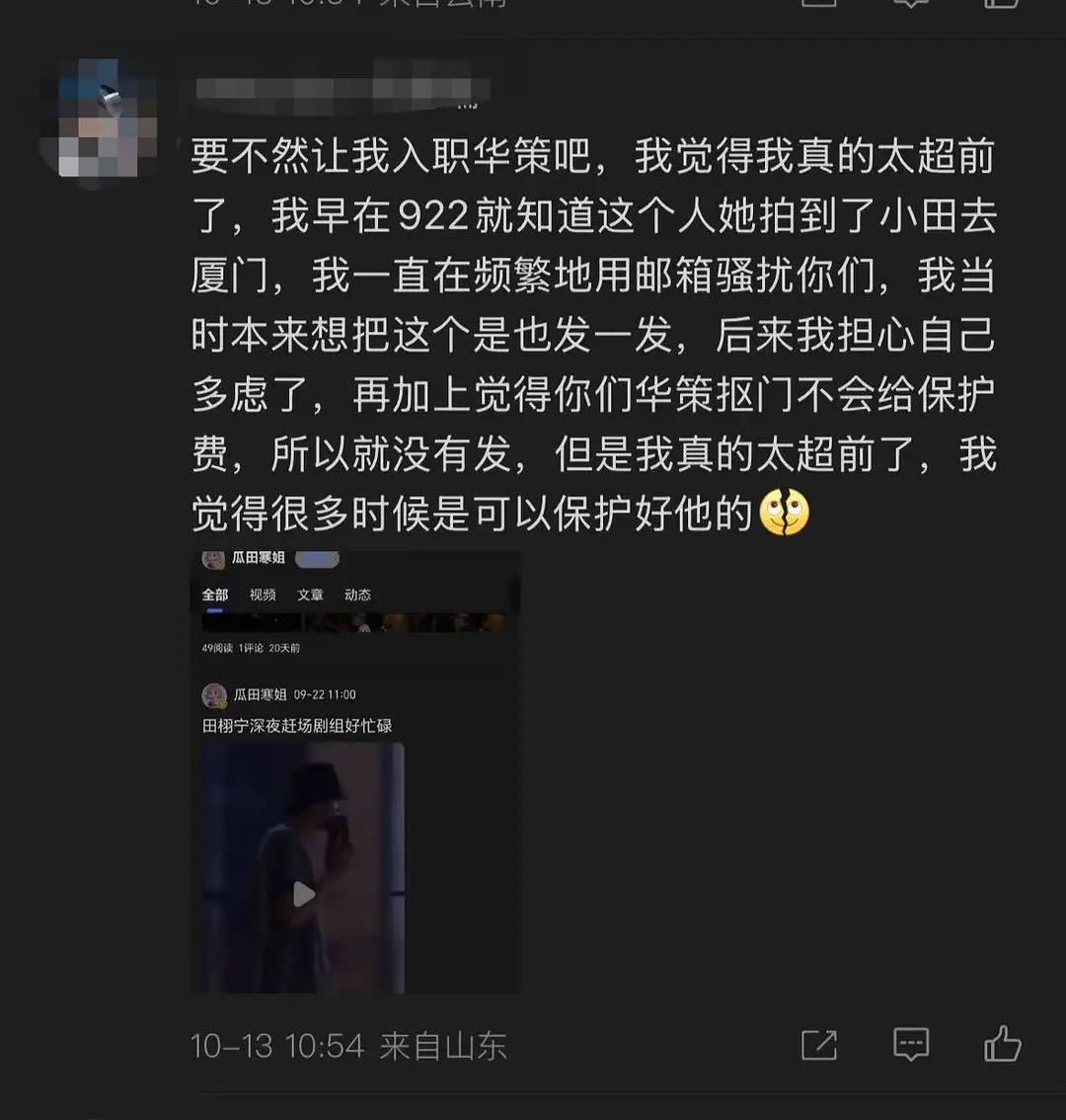 粉丝早就知道还发邮件提醒华策,告诉经纪团队有狗仔偷拍田栩宁。