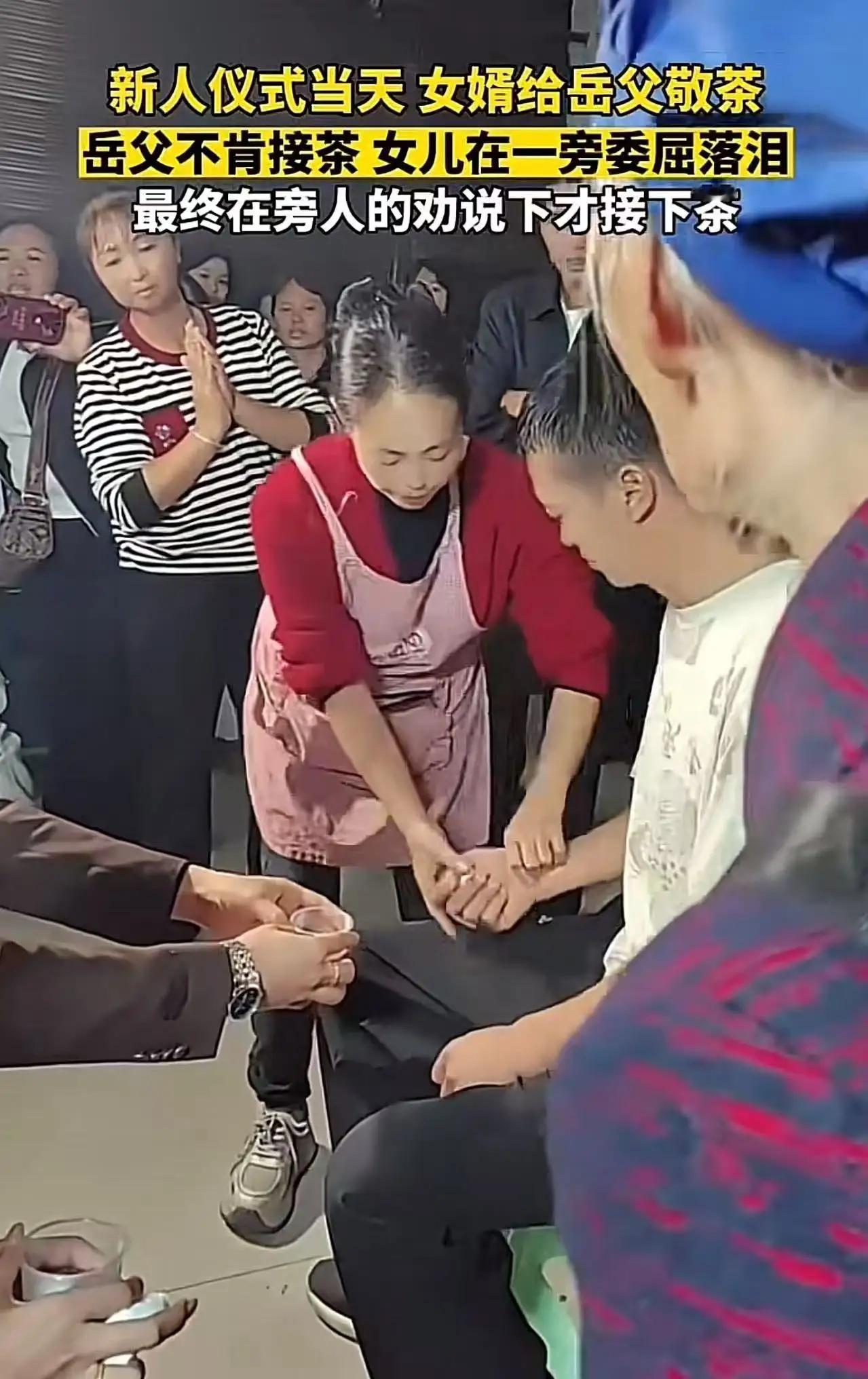 这父亲真是糊涂!女儿结婚,岳父对女婿不满意,在女婿敬茶环节故意不接茶,女儿在一旁委屈落泪,最终在旁人的劝说下,岳父才不情不愿地接下了茶!网友:父亲不是给女婿难看,这是给女儿难看,更给自己难看! 可是,事情的背后,真的只是一个简单的“不给茶”的举动吗?还是隐藏着一段我们未曾触及的家庭裂痕?在这个看似普通的婚礼现场,折射出的是许多家庭中难以启齿的矛盾和父辈的传统观念。我们不得不问:一个家庭的和谐,难道仅仅靠几杯茶的敬意就能衡量吗? 这场景,似曾相识。多少家庭在节日聚会、婚礼喜庆中,也曾上演过类似的“戏码”。父辈们的固执,似乎成了家庭关系中的“隐形炸弹”。他们用自己的方式表达“尊重”,却可能无意中伤害了下一代的感情。女儿的委屈、女婿的尴尬,都是被传统束缚的无声呐喊。 而更令人心疼的是,女儿的眼泪。那不是单纯的因为一杯茶,而是对家庭、对父母、对未来的迷茫和失望。她或许在心里问:我努力维系的这个家庭,到底还有没有温度?父亲的冷漠,是不是意味着,他只在乎“面子”和“规矩”,而忽略了女儿的感受? 这不禁让人反思:我们到底在传承什么?是尊重与爱,还是盲目的传统与面子?父亲的行为,是否也在无形中教会了下一代:在家庭关系中,“尊重”变成了“表面功夫”,而“爱”被埋藏在了“面子”之后? 更深层次的问题是,家庭教育的缺失和代际沟通的断裂。我们常说“孝顺”,但孝顺的真正内涵是什么?是盲从?还是理解和包容?如果父辈们能换位思考,或许会发现,女儿的幸福才是家庭的真正幸福。 当然,事情的结局并不一定非得是“岳父收下茶”的那一刻才算结束。家庭的和谐,或许更需要的是理解和尊重的桥梁,而不是一时的“面子”。我们每个人都在用自己的方式,试图在传统与现代之间找到平衡点。 这场“敬茶事件”,只不过是千万家庭中微小的缩影。它让我们看到了传统的束缚,也提醒我们:家庭的温暖,源自每一个细节中的关心和理解。我们不能让“面子”成为家庭的绊脚石,更不能让“传统”变成伤害亲情的利刃。 也许,下一次当你看到类似的场景时,不妨停下来想一想:我们是否可以用更温暖的方式,去传递尊重和爱?毕竟,家庭的幸福,不在于一杯茶的敬意,而在于彼此心中的那份理解和包容。 让我们都成为那个愿意用心去聆听、去理解的人吧。因为,只有这样,家庭才能真正温暖如春。女婿的苦恼 女婿的见面礼