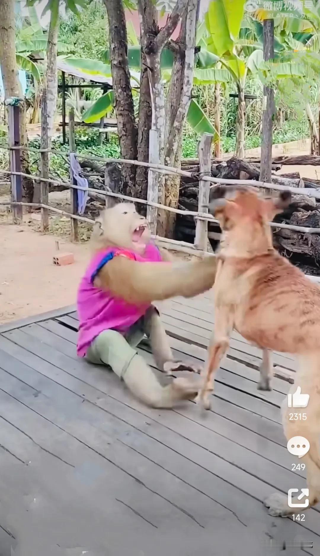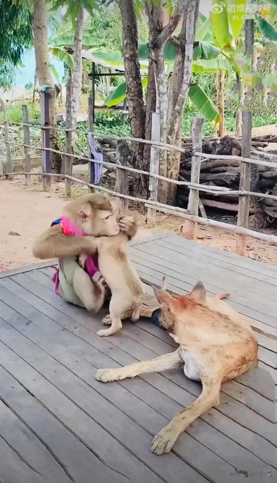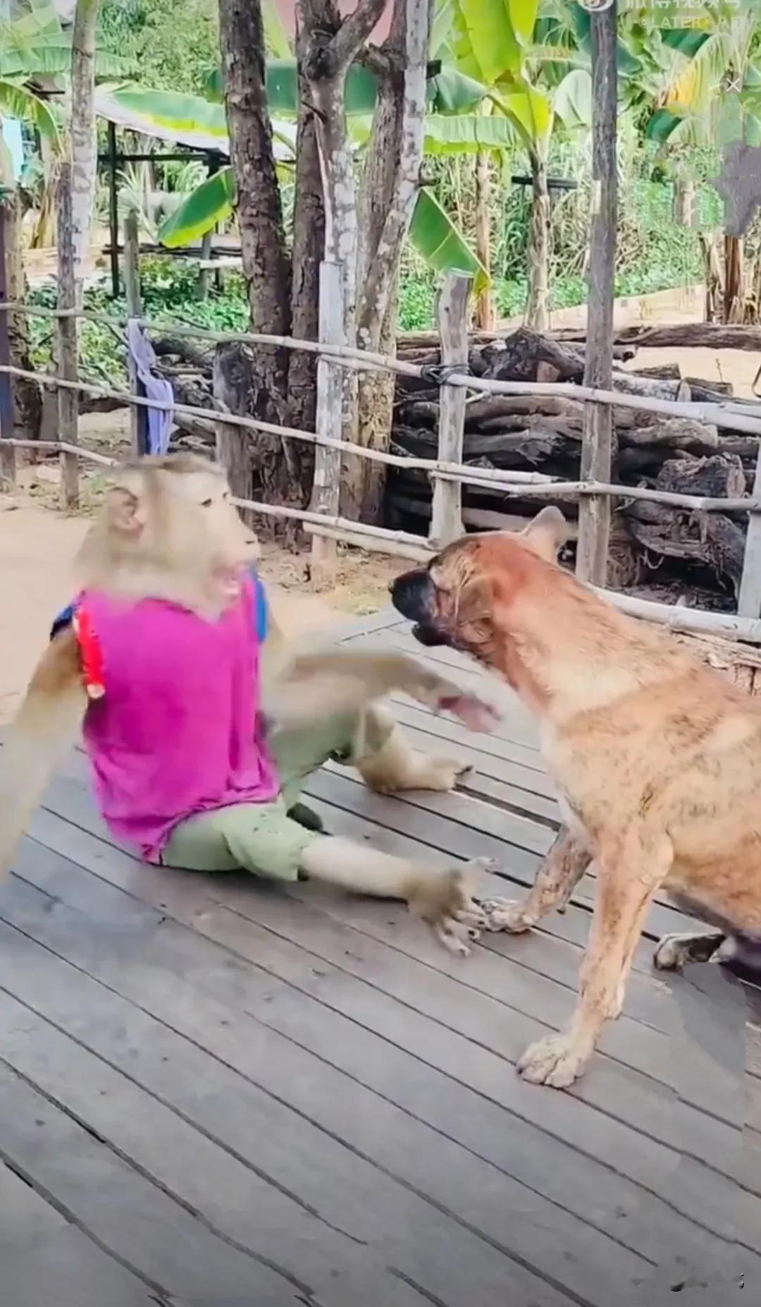 泼猴的爪子咋这么欠啊,狗狗安安生生地趴在那儿,没有妨碍到它,它却要去扒拉狗狗,故意折腾人家。 先是拎着小狗的脚,把小狗提过来又啃又咬,肆意玩弄,就像玩一个会动的玩具。 可怜的小狗,被它蹂躏得生不如死,只能远远地躲开。 泼猴还不肯罢休,一把抓住小狗的后腿硬生生将它扯回来,又玩弄了半天。 小狗拼命挣扎,终于逃出了它的魔爪。 看见小狗跑开了,泼猴甚感无趣,竟然又将邪恶的目光转向一旁的大狗,想将大狗也扯过来,像刚才那样玩弄一番。 但大狗可不是省油的灯,刚才泼猴欺虐小狗时,大狗就已经憋着一肚子的火。 但可能小狗不是自己的孩子,加上泼猴平时也比较凶悍,大狗虽然不爽,但强忍着怒火没有发作。 现在竟然欺负到自己头上了,是可忍,孰不可忍,大狗愤怒地站起来,咆哮着就向泼猴扑过去。 泼猴没想到平时温顺的大狗竟然敢反抗,一下子被打了个措手不及。 虽然张牙舞爪地将大狗逼退,看似色厉内荏,但湿漉漉的裤子将它内心的虚弱和恐惧暴露无遗。 哈哈哈,居然被吓尿了,真是一只又坏又丑又怂的泼猴。