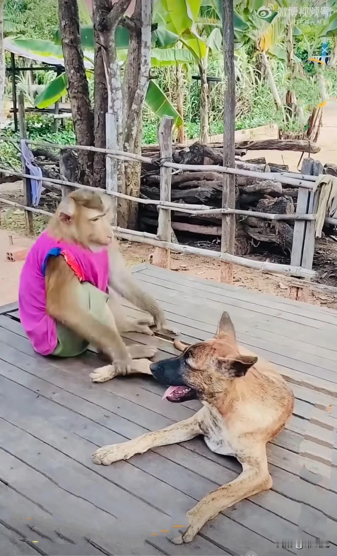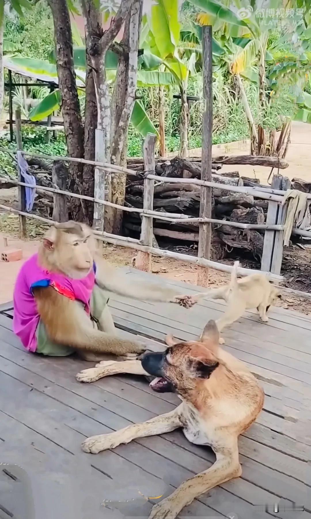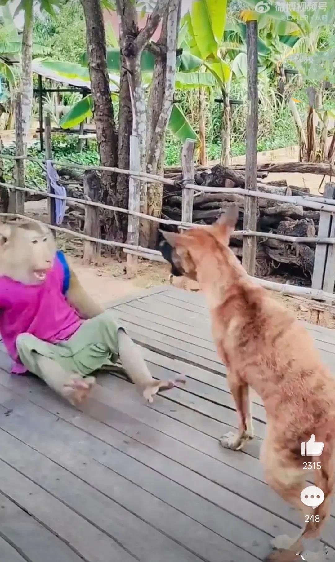 泼猴的爪子咋这么欠啊,狗狗安安生生地趴在那儿,没有妨碍到它,它却要去扒拉狗狗,故意折腾人家。 先是拎着小狗的脚,把小狗提过来又啃又咬,肆意玩弄,就像玩一个会动的玩具。 可怜的小狗,被它蹂躏得生不如死,只能远远地躲开。 泼猴还不肯罢休,一把抓住小狗的后腿硬生生将它扯回来,又玩弄了半天。 小狗拼命挣扎,终于逃出了它的魔爪。 看见小狗跑开了,泼猴甚感无趣,竟然又将邪恶的目光转向一旁的大狗,想将大狗也扯过来,像刚才那样玩弄一番。 但大狗可不是省油的灯,刚才泼猴欺虐小狗时,大狗就已经憋着一肚子的火。 但可能小狗不是自己的孩子,加上泼猴平时也比较凶悍,大狗虽然不爽,但强忍着怒火没有发作。 现在竟然欺负到自己头上了,是可忍,孰不可忍,大狗愤怒地站起来,咆哮着就向泼猴扑过去。 泼猴没想到平时温顺的大狗竟然敢反抗,一下子被打了个措手不及。 虽然张牙舞爪地将大狗逼退,看似色厉内荏,但湿漉漉的裤子将它内心的虚弱和恐惧暴露无遗。 哈哈哈,居然被吓尿了,真是一只又坏又丑又怂的泼猴。
