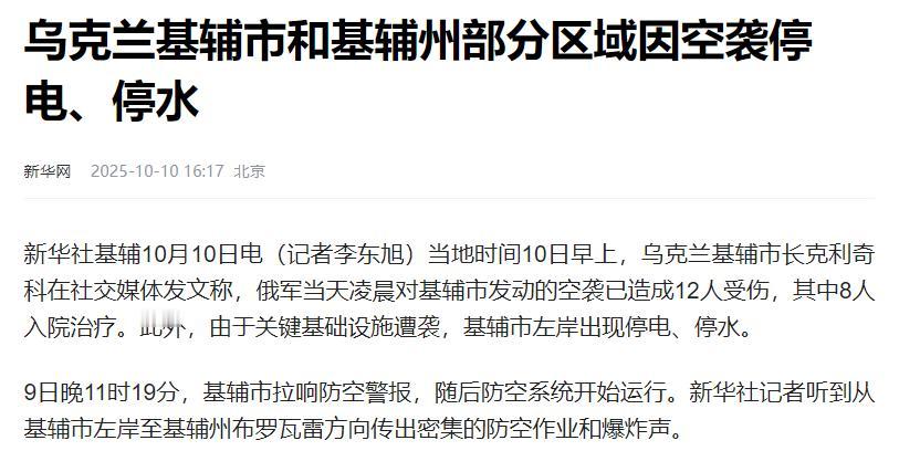 基辅周边持续停水停电,市民堵路抗议,要求泽连斯基负起责任!   当地时间10月10日凌晨,俄军对基辅发动的大规模空袭,直接把目标对准了城市周边的能源命脉。4个水电站、2个火电厂、2个热电厂接连被击中,大量变压器也受损严重。   消息刚传出来时,基辅市长克利奇科就第一时间在社交平台发声,不仅确认了空袭造成人员受伤的消息,还急着提醒市民:“左岸区域已经停水停电,大家赶紧囤水、囤食物,多给手机充点电。”   乌克兰能源部也很快表态,说俄军就是冲着能源设施来的,工作人员正拼了命控制局势,但从后续情况看,这波冲击实在太大,根本压不住。   短短不到40个小时,停水停电的范围就从左岸蔓延到了基辅周边多个区域,博尔什加夫卡的市民率先扛不住了。   连续两天没水没电,家里的暖气早就凉透了,冬天里屋里跟冰窖似的;想做饭连自来水都没有,只能靠之前存的一点水勉强维持;手机信号时断时续,想联系家人都费劲,日常日子完全没法过。   就是在这样的困境下,大批市民走上街头封锁道路,他们的要求很实在:“泽连斯基政府得负起责任,赶紧把水和电恢复了!”   乌克兰政府也不是没动作,乌克兰最大的私营能源企业DTEK公司早就派了抢修队赶去现场,基辅州州长也说州里在不少社区设了应急点,给大家发水、发食物,还想着用其他备用设施临时发电。   可问题是,能源设施坏得太彻底了,好多关键零件本地根本没有,得从波兰调运,光路上就得花两周时间,这对急着用水用电的市民来说,实在是等不起。   好在国际社会没闲着,欧盟之前就从战略储备里调了500台发电机过来,小的能供一户人家用,大的甚至能撑得起一整家医院的运转,算上之前送的,通过欧盟民防机制运到乌克兰的发电机已经超过5500台,还有变压器、高压设备这些急需的物资。   联合国开发计划署也联合欧盟给乌克兰其他城市送过热电联产机组,就是想帮着建更稳的能源供应体系。   但远水解不了近渴,对现在还在寒风里盼水盼电的基辅市民来说,最实在的还是眼前的民生问题能尽快解决。   不管局势多复杂,老百姓的日子还是得过下去,保障好基本的水、电、暖,才能让普通人心里有底,这点无论是乌克兰还是俄罗斯都一样!