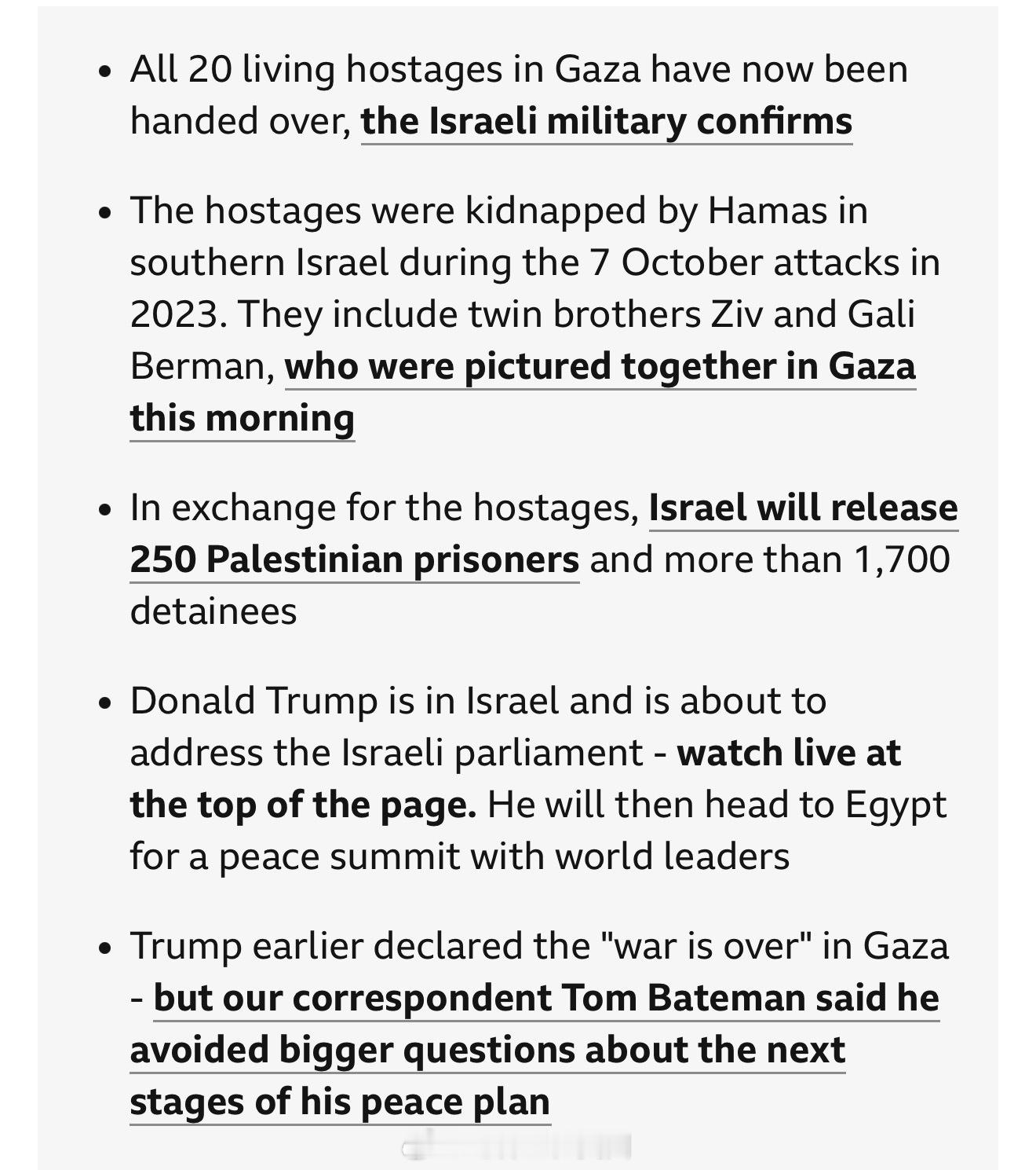 以色列军方确认,加沙地区现存的20名人质已全部获释。