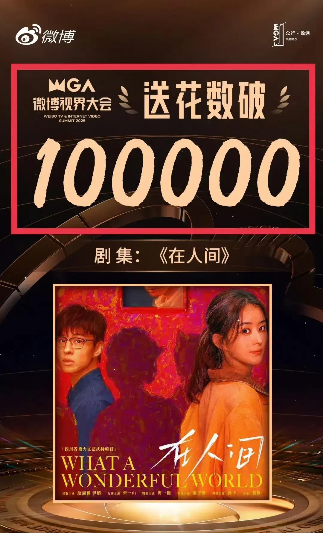 好消息,恭喜由赵丽颖主演兼出品人的网剧《在人间》在微博视界大会送花数破10万啦!