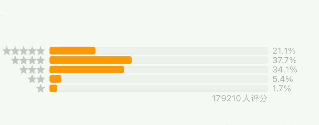 五星的比例下降的太严重了,要是没有大量五星对冲的话评分只会一降再降,这才开分几天就降了0.2…,17.9w人打分,百分之21的五星,也就是说还不到4w人打五星,四星也才6w人,没动起来的檀丝至少占一半儿,剩下8w全是打三星二星一星的黑子,粉丝都不动起来的话那真的没办法,黑子这么努力一刻不停的在下嘿氵,三星都快赶上四星了,一直说这个评分低了低了,想要再高一点儿,现在的情况就是连原来的7.6都保不住…