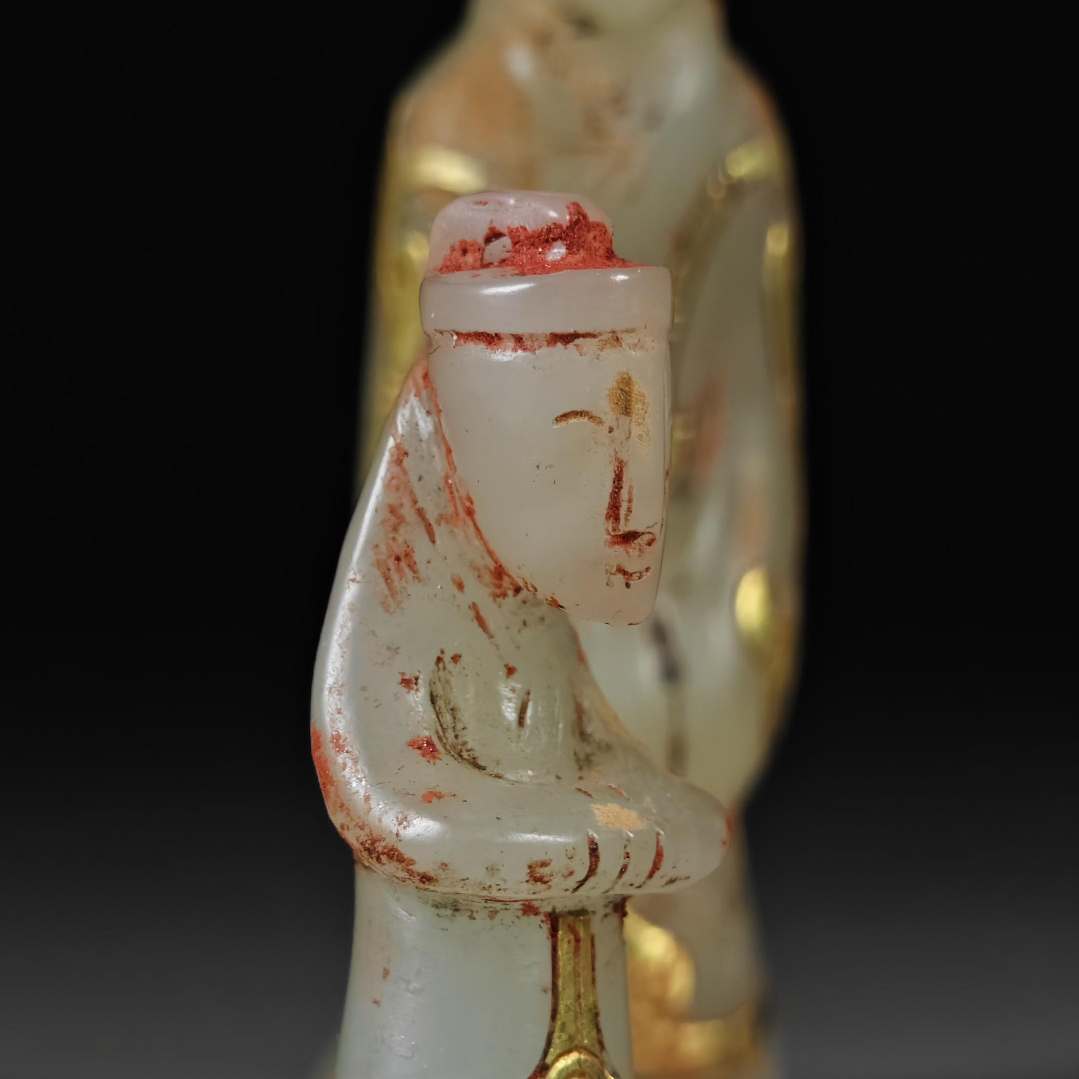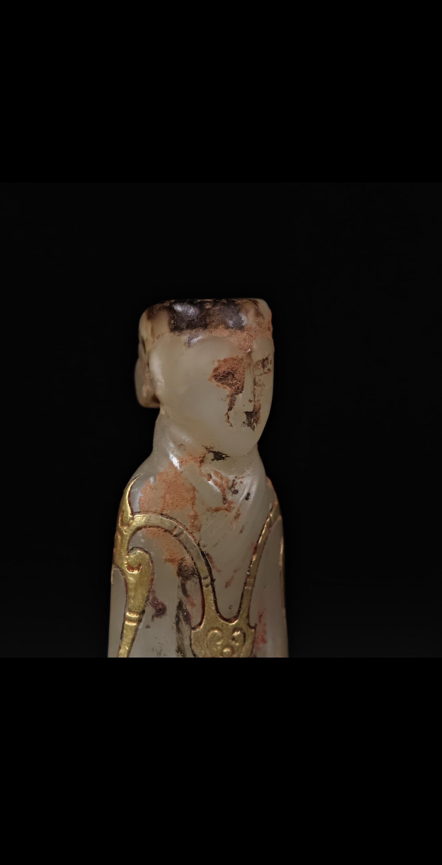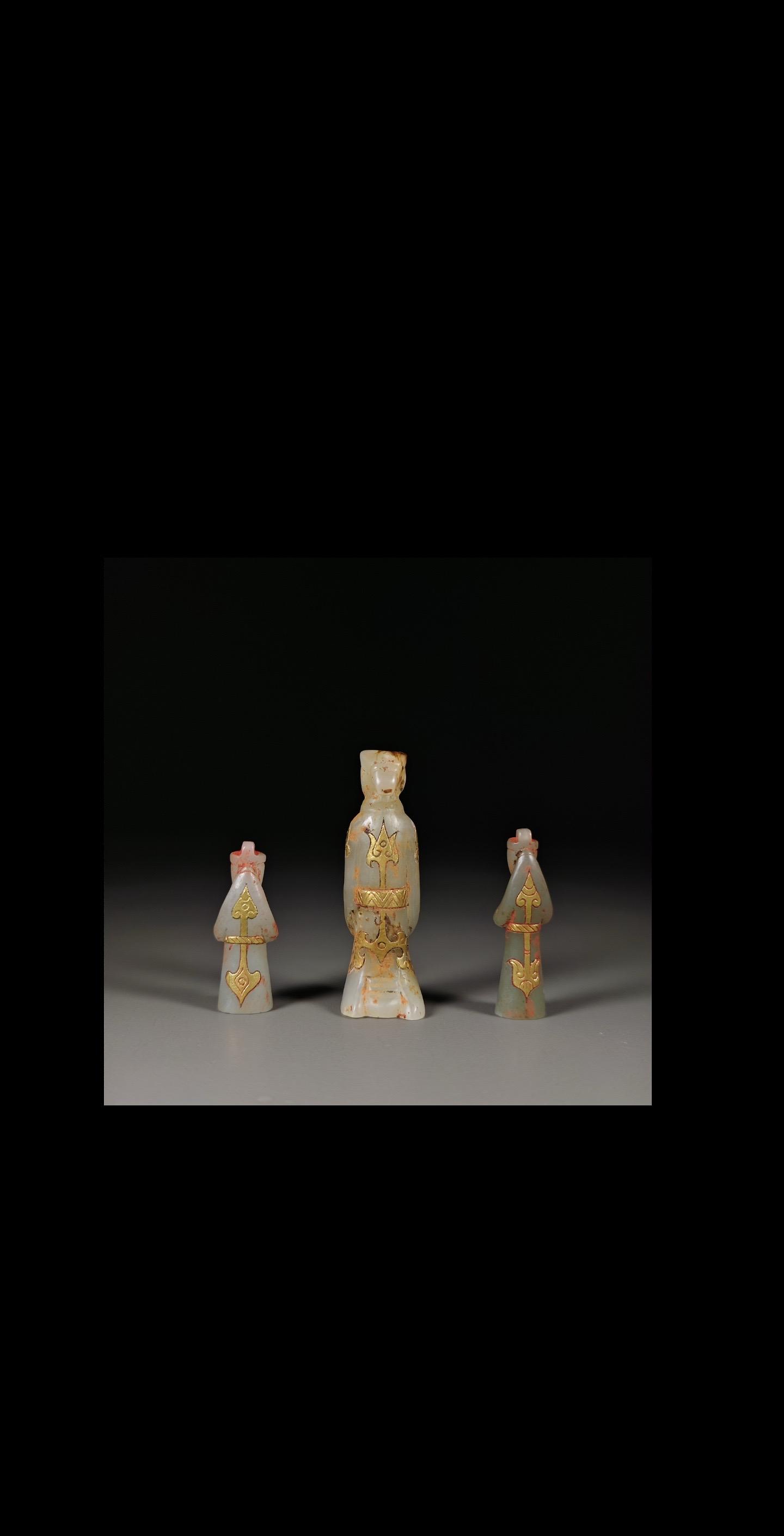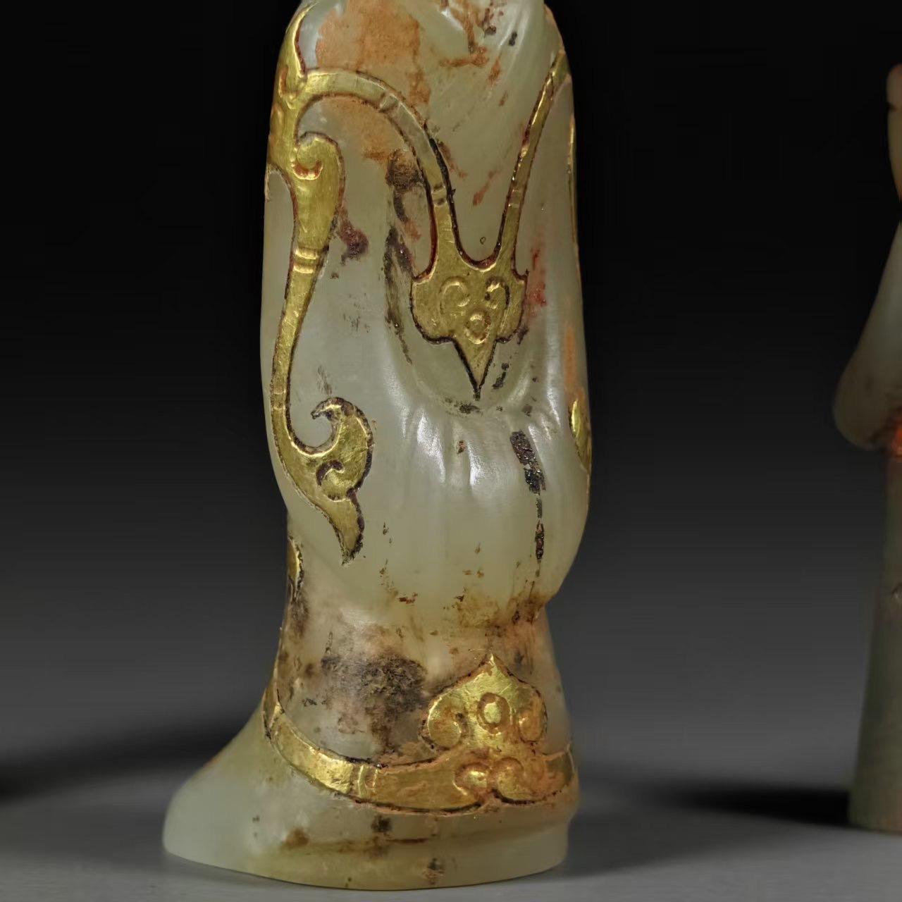 错金玉人。这是一组汉代错金玉人,它以和田玉为材质,采用了汉代极具代表性的错金工艺——在玉质表面雕琢出精细凹槽,嵌入金丝后打磨平整,使金玉交辉,尽显华贵。这类玉人可能是汉代贵族的佩饰或礼器,用于彰显身份地位,也可能蕴含着当时人们对长生、祈福的精神寄托,是研究汉代玉器工艺、服饰文化及社会观念的重要实物资料。