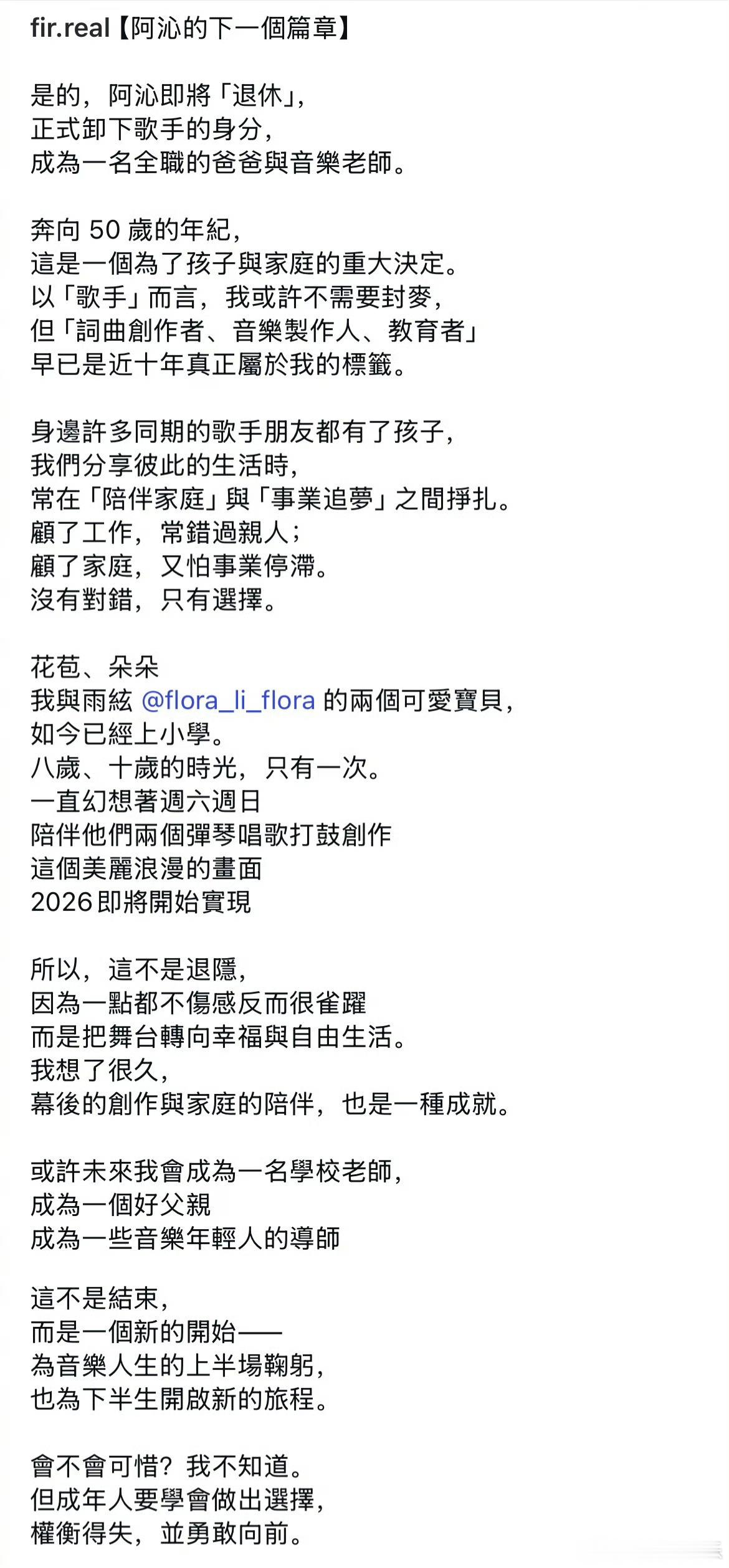 据悉,阿沁于2015年与小14岁的模特女友订婚,后育有两女,2024年,阿沁离开飞儿乐团。