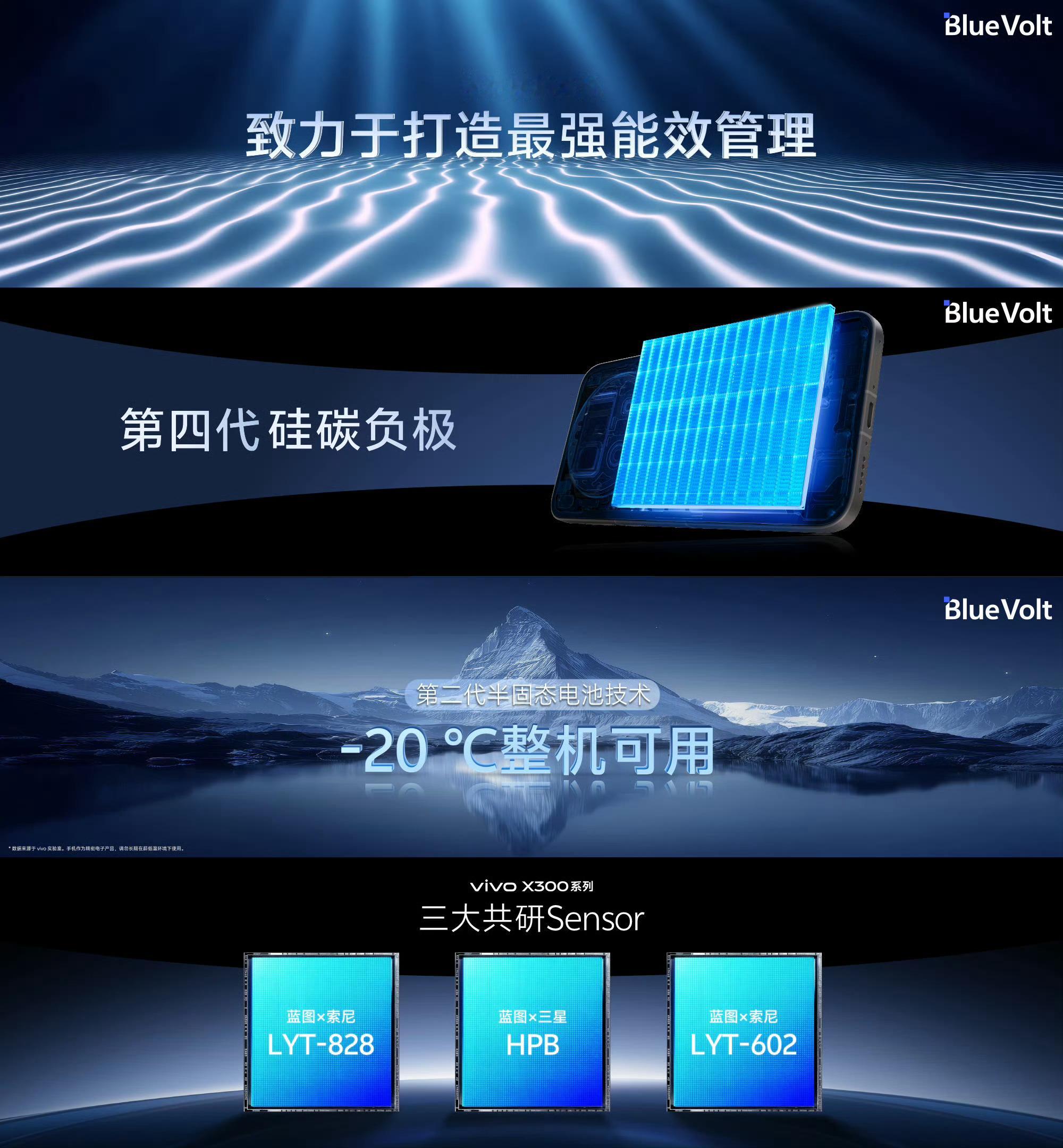 蓝海续航系统致力于打造最强能效管理,电池技术持续领先,X300系列蓝海电池搭载第四代硅碳负极,更轻薄,容量更大,还有第二代半固态电池技术,-20°严寒中仍能正常使用。