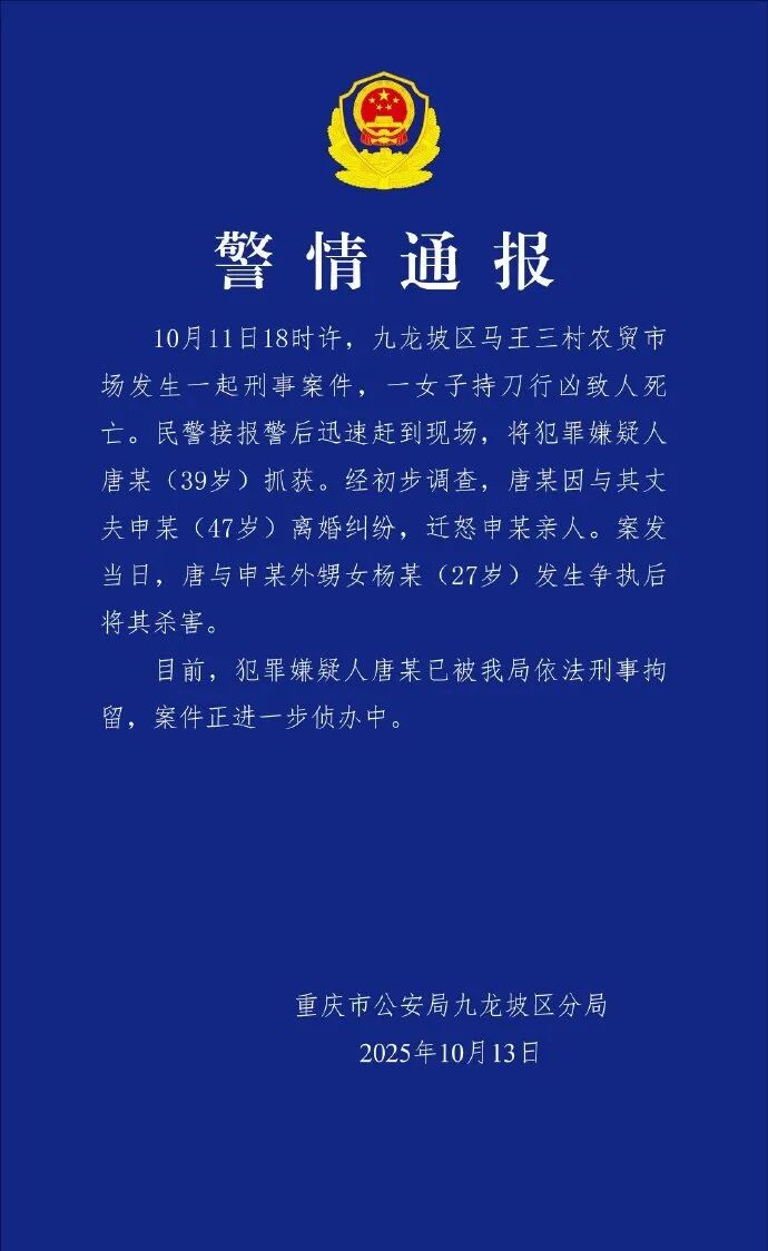 10月11日18时许,九龙坡区马王三村农贸市场发生一起刑事案件,一女子持刀行凶致人死亡。民警接报警后迅速赶到现场,将犯罪嫌疑人唐某(39岁)抓获。经初步调查,唐某因与其丈夫申某(47岁)离婚纠纷,迁怒申某亲人。案发当日,唐与申某外甥女杨某(27岁)发生争执后将其杀害。