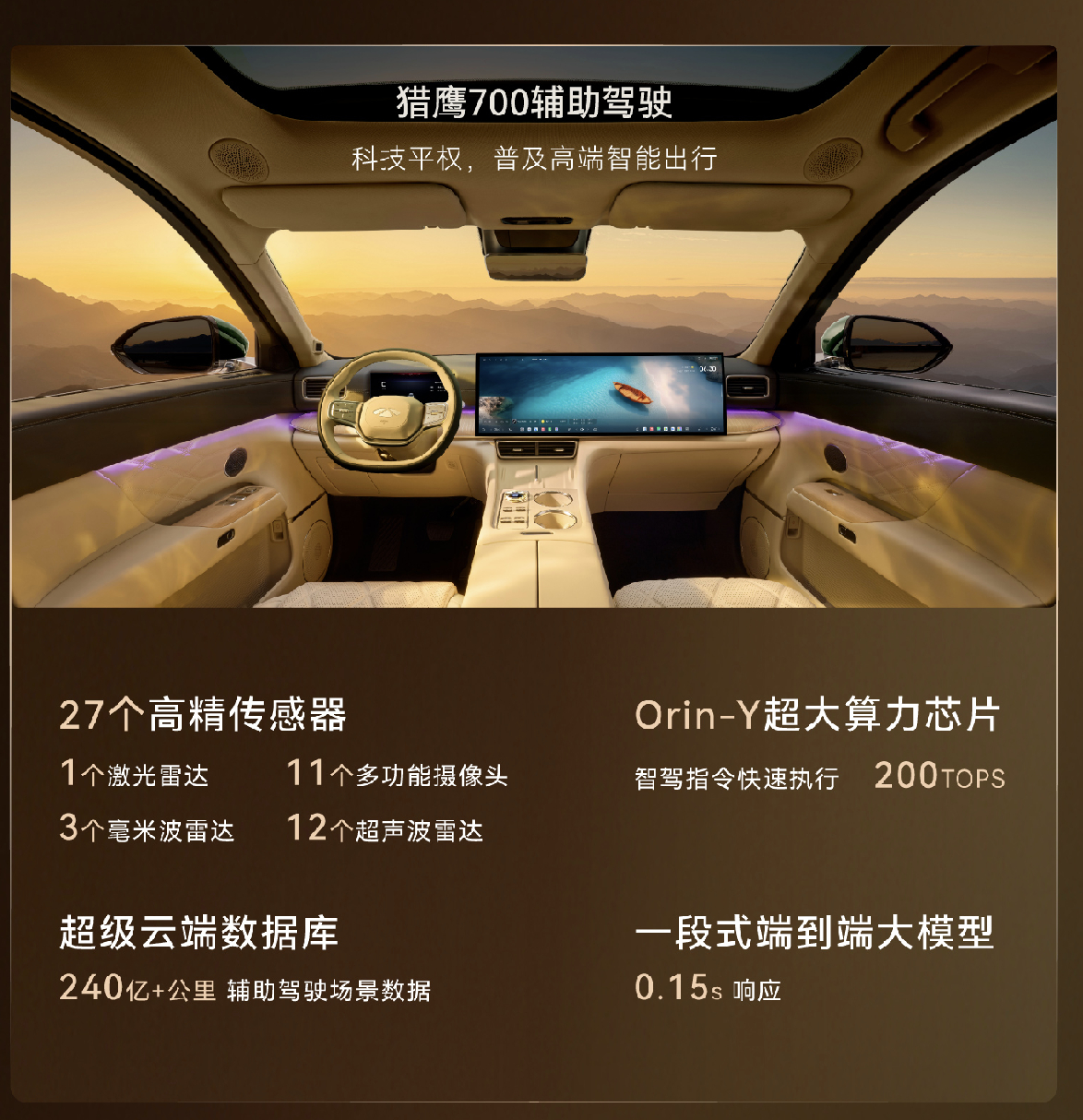 车身用料厚实,热成型钢占比超过75%。全系标配L2+辅助驾驶,高配上还有激光雷达+Orin平台,支持城区、高速NOA。泊车全自动,底盘540°透明显示,新手也能轻松开。