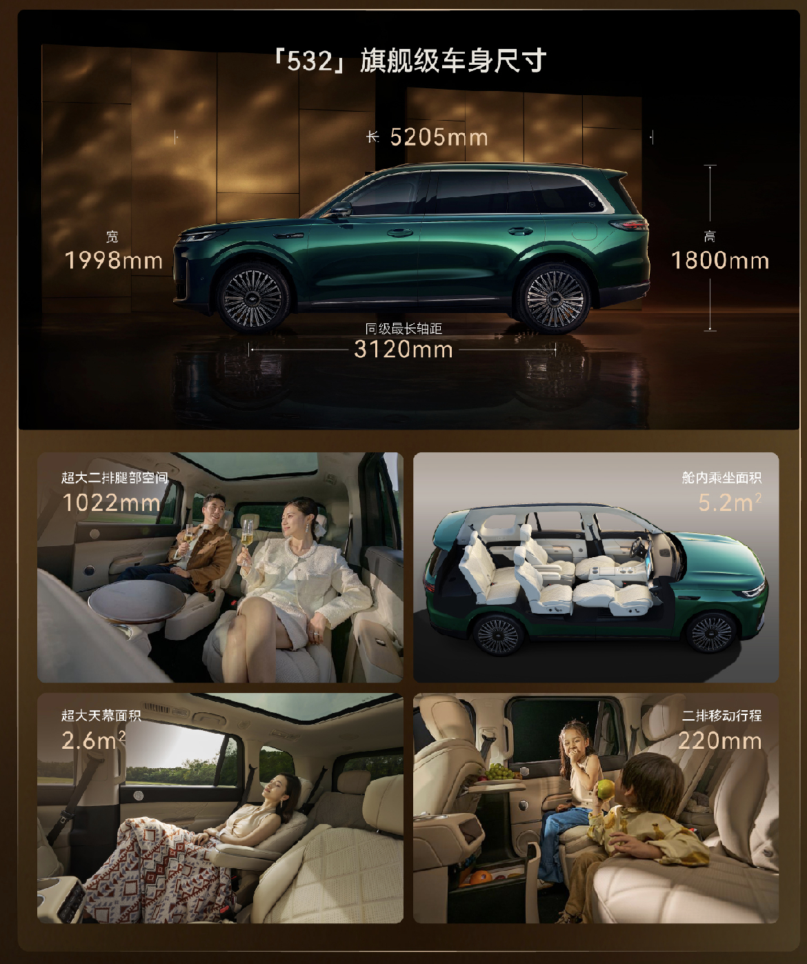 车长5.2米、轴距3.1米,是真·中大型SUV。六座布局,二排是独立大沙发,带腿托、加热、通风。