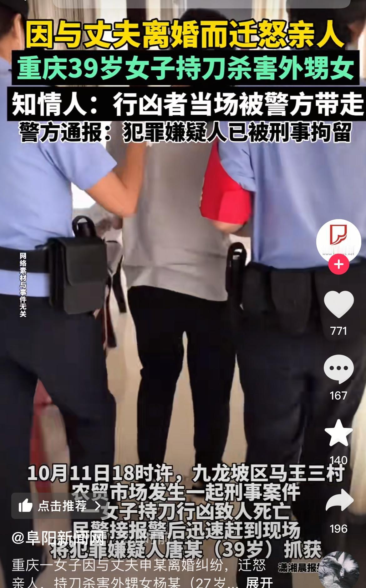 重庆九龙坡马王三村农贸市场血案真相,半路夫妻难有真感情。凶手唐某39岁,外地人,和申某网上认识,2024年走到一起,在农贸市场开了一家卖散装白酒的酒坊,因为酒坊的利益分配问题出现矛盾,进入引发婚姻危机。唐某多次去酒坊找申某谈判,在凶案发生的前一次唐某在酒坊和申某及其姐姐发生肢体冲突,唐某受伤住院。等唐某出院,再一次来到酒坊,申某躲着不见,是申某的侄女杨某看店,两人发生冲突,这一次唐某没有忍,所有的不满都发泄到无辜的杨某身上,导致杨某被杀。半路夫妻,很多都是同床异梦,如果没有孩子牵绊,感情就像稻草人,一吹就倒。重庆富商离婚案 杀妻抛尸案 婚内致死案