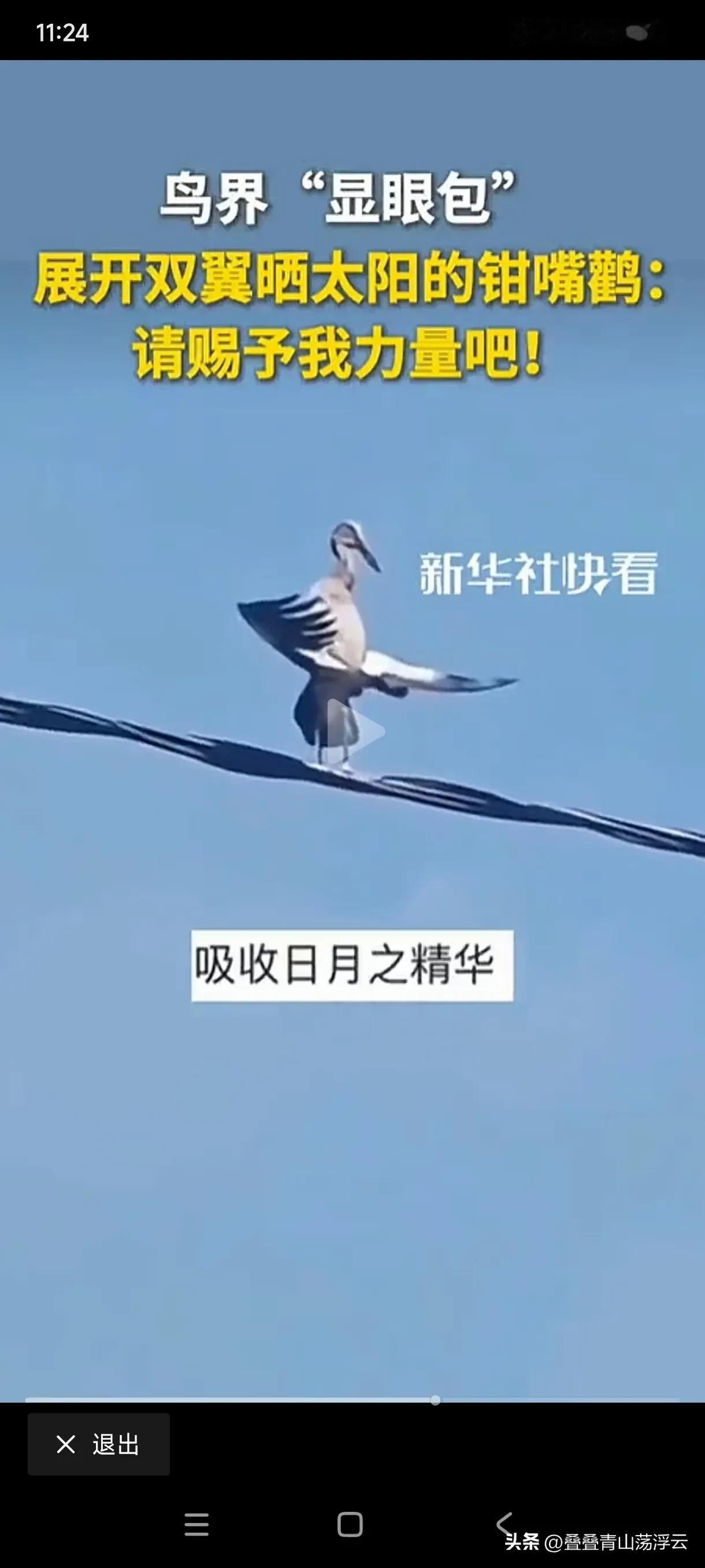 偶滴神啊,请赐予我力量吧! 看看,这就是鸟界鼎鼎有名的“显眼包”,它叫钳嘴鹳,喜欢反向张开双翼晒太阳,吸收太阳能量。 看这图,这鸟像极了在修炼什么“大威天龙”之类的神功哈[大笑][大笑]