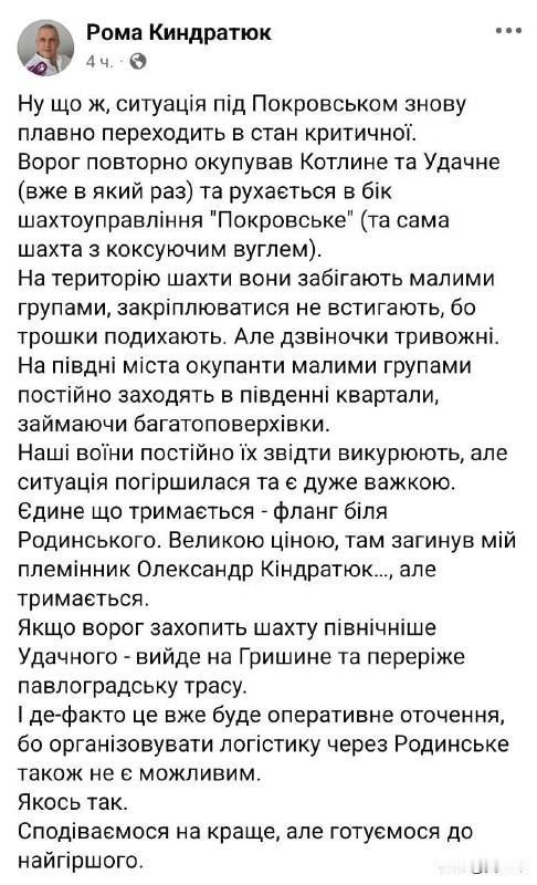 【“已做最坏准备”:乌克兰守军眼中的波克罗夫斯克】 10月13日,乌克兰军人罗曼·孔德拉秋克在脸书上表示,波克罗夫斯克附近的局势再度濒临临界点。俄军已重新占领科特利诺耶和乌达奇诺耶,并正向“波克罗夫斯克”矿务局推进。 孔德拉秋克指出,敌方小股部队多次进入煤矿区域,但未能成功站稳脚跟。在波克罗夫斯克南部,巷战仍在持续——俄军占据部分高层建筑,但乌军正将其从这些建筑中驱逐出去。 罗津斯基附近的侧翼阵地仍在坚守,不过局势依旧极度严峻。若敌方攻占乌达奇诺耶以北的矿区,便能向格里希诺推进,并切断巴甫洛格勒公路,而这实际上将导致波克罗夫斯克陷入战役包围。“我们抱最好的希望,但做最坏的准备。”
