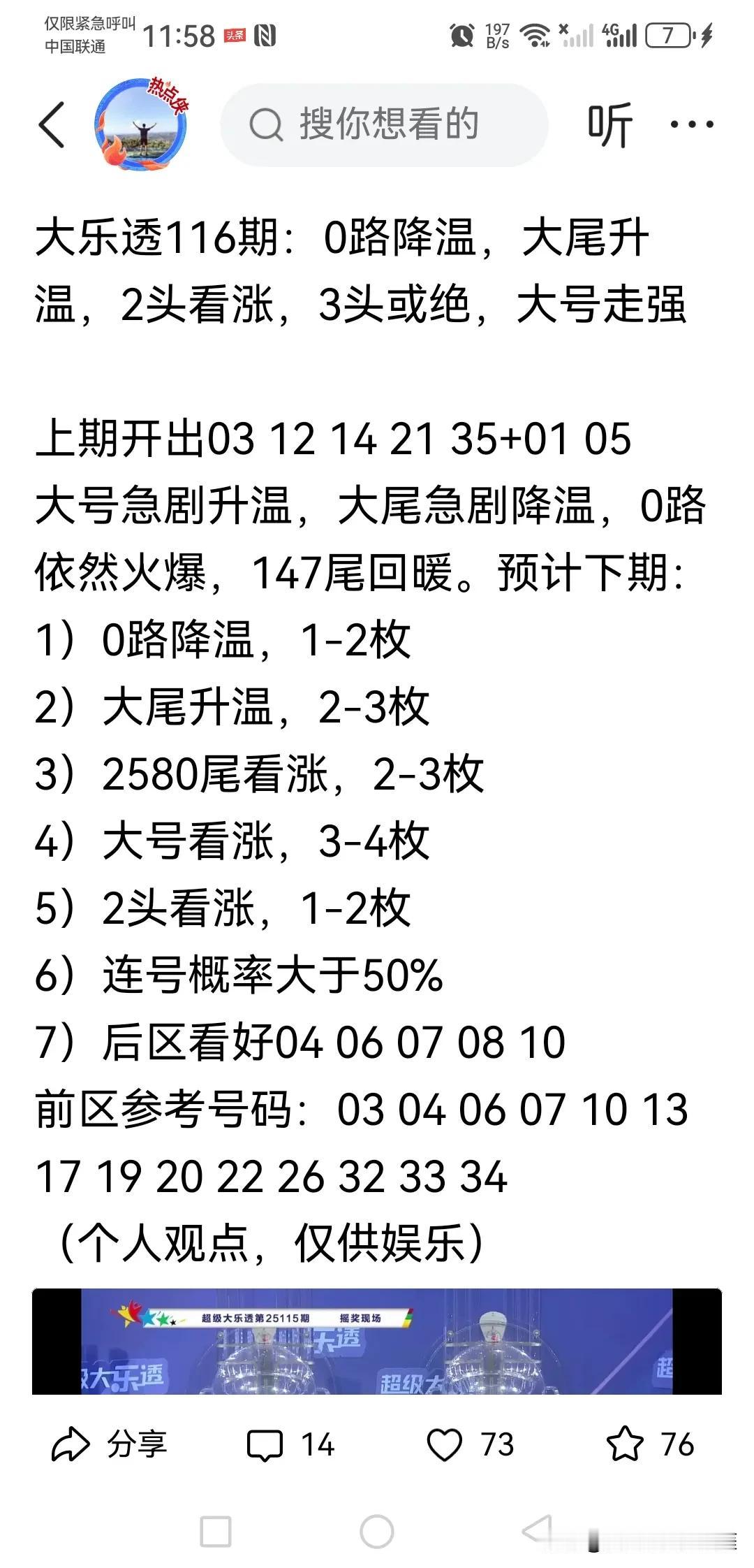 大乐透昨夜空开,全国彩民一夜无语! 看似正常的组合却无人幸运命中,而一些奇葩组合却从不缺少幸运儿,看来越来越多的人在追求奇葩号了。 虽然我的大方向预测绝大部分是正确的,却也和全国彩民一样,依然摆脱不了几乎颗粒无收的命运! 选号难,难于上青天!