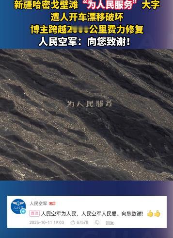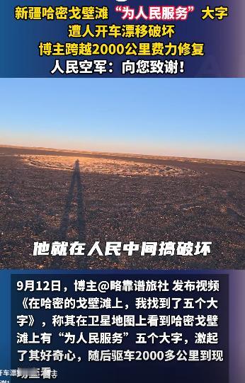 网红博主为了拍一张照片,居然调用了一颗卫星?空军看到后指示该发表,向你致敬! 9月的卫星图像里,新疆哈密戈壁滩上的五个巨型大字格外扎眼。 “为人民服务”每个字都有篮球场那么大,在苍茫天地间泛着黑石的哑光。 可谁也没料到,“人”与“民”之间那片本该平整的黑石地面,竟布满了像伤疤一样的车辙圆圈,最深的沟壑能把手指没到掌根。 这处扛过40年风沙的地标,没败给自然,却遭了人为的糟蹋。 让这道“伤疤”被看见的,是南方博主“略靠谱旅社”。 9月12日,他在卫星地图上偶然发现这个奇特地标,一时好奇便驱车出发。 2221公里的路程走了整整六天,高速爆胎、车陷沙土,最后15公里更是靠着指南针一点点摸索,才终于站到了大字跟前。 可眼前的景象让他瞬间红了眼:地表的砾幕层像碎玻璃一样散落,那是戈壁最珍贵的生态保护层,一旦破坏几十年都恢复不了。 这可不是普通的石头字,上世纪60年代,解放军第八航校的官兵扎根在这片没GPS的戈壁,飞行员训练时常常迷航。 将士们顶着40℃高温,用皮尺一寸寸量、铁锹一锹锹挖,花了五个多月才用黑戈壁石铺出这片7.5万平方米的地标。 更特别的是,这片戈壁曾是核试验地、航天测控点,这五个字早成了刻在大地上的国家记忆。 破坏痕迹的主人很快被网友扒了出来。 小红书账号“新疆平头哥旅游越野带队”里,藏着他此前发布的视频。 白色越野车在“人民”二字间疯狂漂移,车轮卷起的石子砸在黑石上噼啪作响,配文里还带着炫耀的语气。 可面对全网指责,他删了视频,换了个疑似小号发视频喊冤,我就是路过拍个照,遭网暴太冤了,甚至狡辩“这地方早被人破坏过”。 目前,他的账号已被平台禁言,没等破坏者认错,博主已经撸起了袖子。 为了找颜色匹配的黑石子,他跑遍哈密的矿业公司和老砂厂,两天下来手指磨得发红,才终于凑齐20吨石料。 怕重型车二次破坏,他把石料卸在3公里外的铁路边,用小货车一趟趟转运,整整跑了27趟。 戈壁的日子不好熬,白天太阳晒得石头烫手,几个人蹲在地上徒手填沟壑,手上全是水泡。 夜里气温降到零下,就挤在帐篷里啃干粮。就这样干了七天,所有车辙终于被填平。 可修复完想拍张全貌却犯了难——新疆全域禁飞无人机。 最后没办法,他辗转联系上长光卫星,才等到“吉林一号”过境的23秒窗口期。 9月28日12时45分51秒,卫星在高空按下快门,传回的图像里,五个大字终于恢复了完整的模样。 10月11日,人民空军官方账号在他的视频下留了言,人民空军为人民,人民空军人民爱,向您致谢! 钧正平也发文痛斥,这标语是艰苦年代信仰的实体化象征,破坏它就是亵渎先辈热血。 截至目前,博主的修复视频播放量超2000万,点赞量突破90万,网友们在评论里说得最多的是,这才是真网红该有的样子。 可这事儿远没结束,博主自掏腰包修完地标,没要一分钱报销;破坏者虽被禁言,却没掏过一分赔偿款。 更让人揪心的是,这处承载着厚重历史的地标,至今没“上户口”,它不是文物,法律上没法对破坏者从重处罚。 但好在网友没放弃,10月10日,请给戈壁标语上户口冲上热搜,大家纷纷呼吁给这些“沉默的地标”一个名分。 地方文旅部门也回应说,正在研究是否将其纳入保护范畴。 当卫星再次掠过哈密戈壁,那五个大字在阳光下格外清晰。 一边是跨越千里搬石头的守护,一边是为流量肆意破坏的嚣张;一边是自费修复的公益心,一边是钻法律空子的狡辩。 这对比里藏着最直白的答案:真正的流量从不是靠糟蹋历史换来的,而是像那些黑石一样,要经得住时间的考验。 “为人民服务”这五个字,从来不是网红的背景板,而是先辈用青春写就的初心。 信息来源:央视军事2025-10-13发布视频