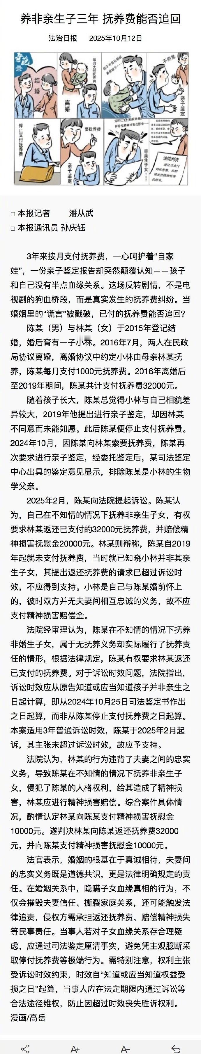 【养非亲生子三年追回抚养费3万2离婚多年后发现孩子非亲生获赔1万元】3年来按月支付抚养费,一心呵护着“自家娃”,一份亲子鉴定报告却突然颠覆认知——孩子和自己没有半点血缘关系。这场反转剧情,不是电视剧的狗血桥段,而是真实发生的抚养费纠纷。当婚姻里的“谎言”被戳破,已付的抚养费能否追回? 法院经审理认为,陈某在不知情的情况下抚养非婚生子女,属于无抚养义务却实际履行了抚养责任的情形,根据法律规定,陈某有权要求林某返还已支付的抚养费。对于诉讼时效问题,法院指出,诉讼时效应从原告知道或应当知道孩子并非亲生之日起计算,即从2024年10月25日司法鉴定书作出之日起算,而非从陈某停止支付抚养费之日起算。本案适用3年普通诉讼时效,陈某于2025年2月起诉,其主张未超过诉讼时效,故应予支持。抚养3年非亲生子抚养费能追回吗(全媒体记者 潘从武 通讯员 孙庆钰)