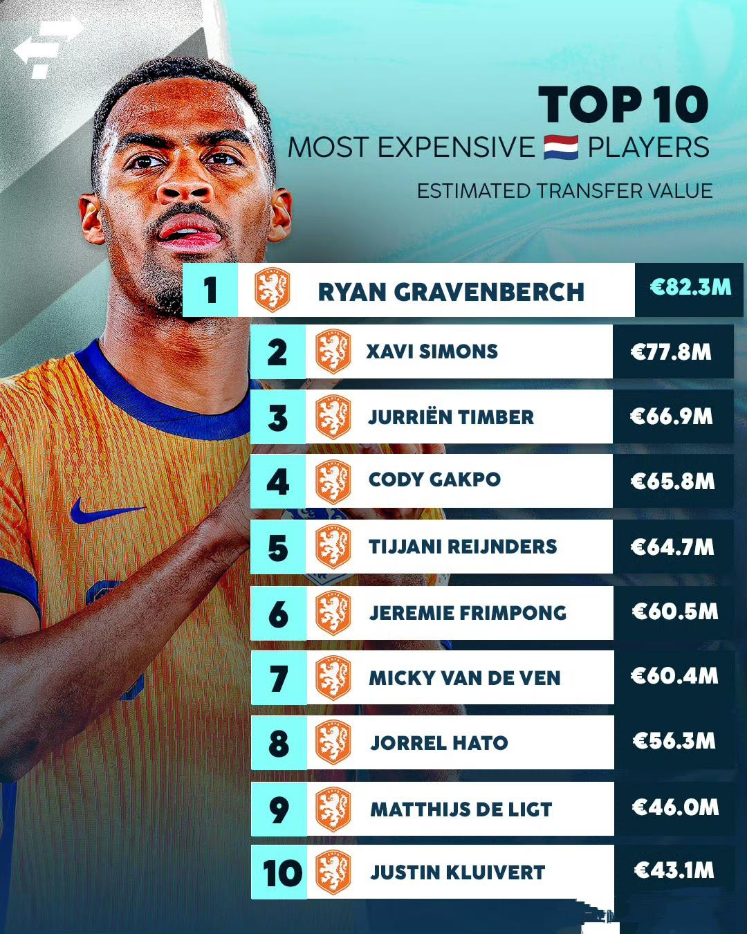 荷兰国家队身价很一般呀,前十球员都没有过亿。 利物浦吹嘘赫拉芬贝赫是世界第一后腰,实际身价也就8230万欧元,23岁不算多。 加克波6580万,范戴克老了没身价。 看来荷兰只是中游球队,转会市场都不看好,人家法国队前场都是过亿球星。[大金牙]