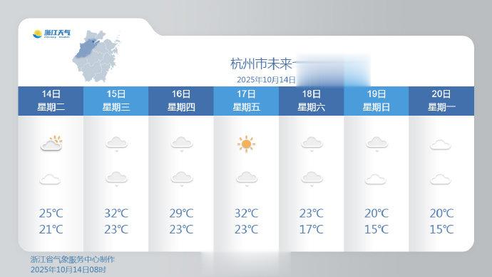 浙江省气象台预计,今天受弱冷空气影响,高温缓解,浙北南部和浙中南地区阴天,部分有阵雨或雷雨,局部暴雨,个别大暴雨。15到16日我省以午后分散性阵雨或雷雨为主。