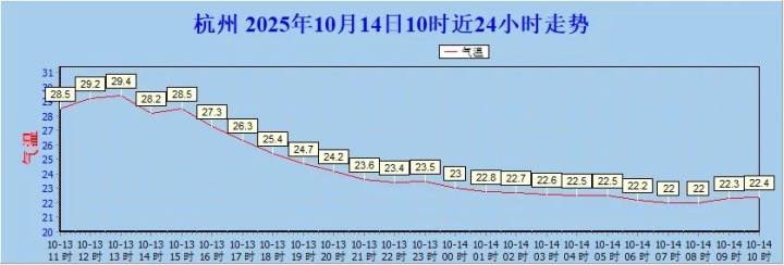 不仅仅是最高气温,下图是近24小时杭州站的小时气温走势,我们可以看到,从昨天18时起,杭州的气温就跌至26℃以下,至今天(14日)10时,整点气温依然只有22℃多,跟平常空调房里的温度差不多了。