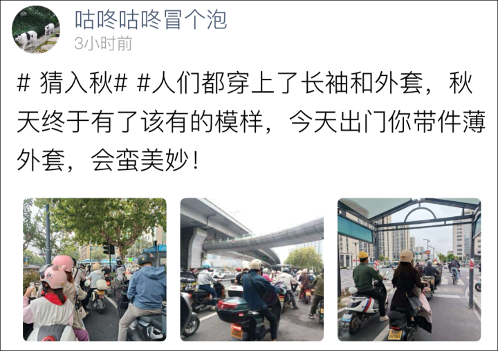 “终于凉快了!”“有点秋天的样子了。”“秋装终于派上用场了。”今早出门可以发现,路上不少人都穿上了长袖和外套。