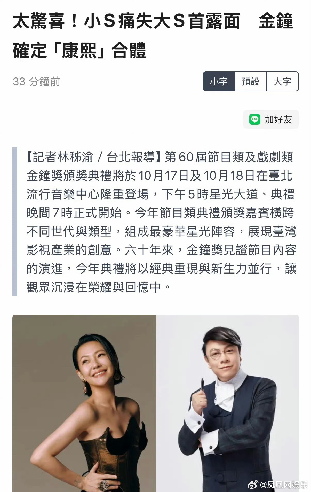 蔡康永小s将在金钟奖合体近日,据台媒报道,蔡康永、小S将作为颁奖嘉宾共同亮相第6