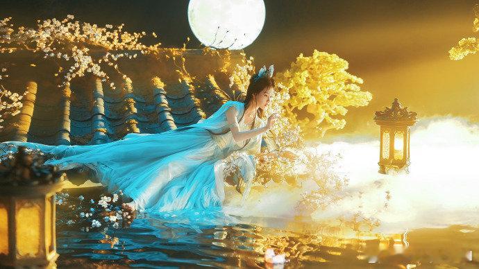 陈都灵镜花水月古装大片陈都灵新国风造型清冷仙姬在月光下美成画!蓝白纱裙配国风意