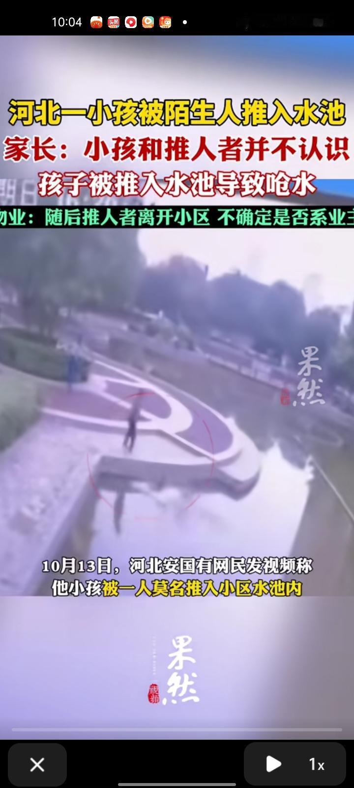 10月13日,保定安国市。网友发视频称,小孩被一陌生人推入水池,导致小孩呛水,小孩和肇事者并不认识。物业回应称,事发后肇事者已离开小区,是否系小区业主不确定。 不管是陌生人还是熟人,推小孩入水都可能造成严重的伤害,甚至危及生命。尤其是孩子没有任何防备,呛水后还可能出现后续的健康风险。 现在警方已经介入,希望能尽快查明真相,给孩子和家长一个交代,也防止类似的危险事件再发生。