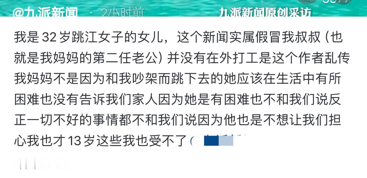太令人唏嘘了,女子背着三个月大的女儿跳入怒江,丈夫却说两人感情很好,从来没吵过架,还说妻子在离家前跟大女儿发生争执,原因是一双二百块钱的鞋。 跟孩子吵了几句而已,真的是她跳江的理由吗?随着更多细节曝光,真相更加扑朔迷离。 大女儿在网上自证清白,女子的老公并不是她的亲爸,她不相信叔叔和妈妈一次架都没吵过,她也不认同妈妈是因为跟她吵架才跳江的,舆论的压力让她喘不过气,快要碎掉了。 到底什么才是压垮女子的最后一根稻草,希望能真相大白,要不然小女孩该有多自责,以后的日子怎么过?