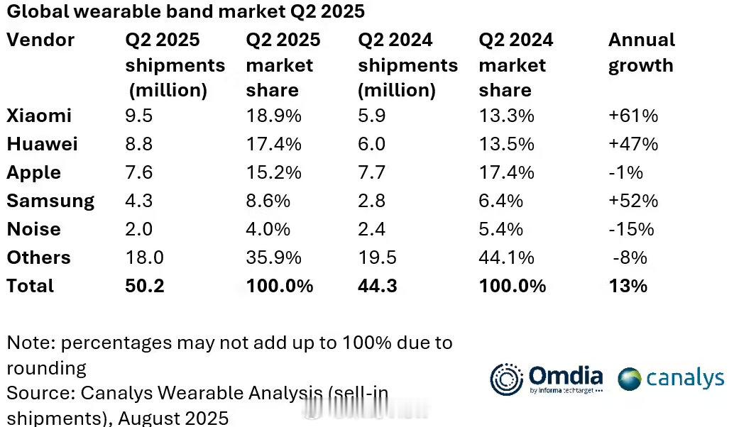 Omdia发布全球可穿戴腕带设备市场2025年第二季度中,小米、华为、三星、苹果、Noise为前五名。