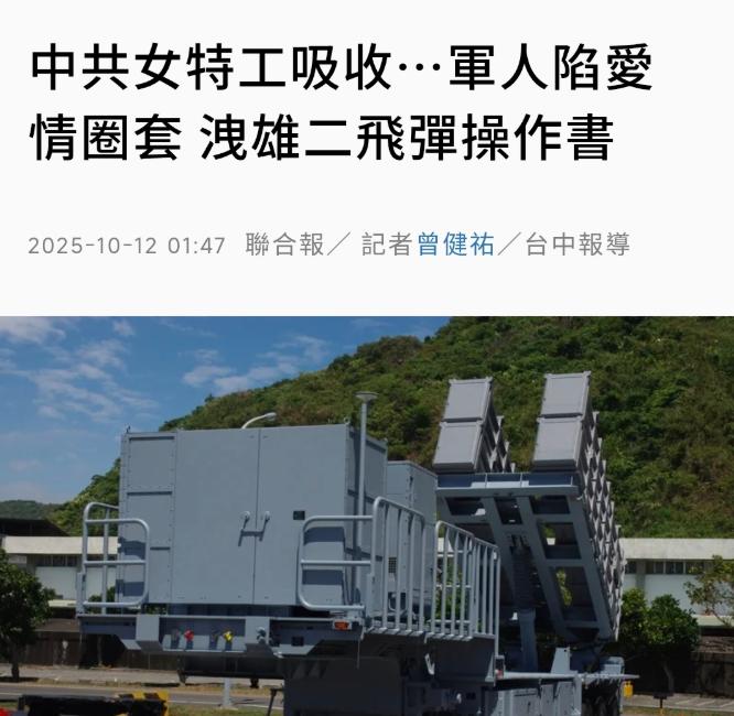 10月12日,台湾媒体报道称,台湾海军海锋大队林姓士兵被大陆女特工吸收,陷入爱情圈套,泄露了台湾雄风二型导弹操作书! 麻烦看官们右上角点击一下“ 关注”,既方便您进行讨论和分享,又能给您带来不一样的参与感,感谢您的支持! 10月12日,台湾媒体突然抛出一条颇具戏剧性的消息:海军海锋大队的一名林姓士兵,因为与一位大陆女特工陷入感情关系,最终不慎泄露了雄风二型导弹的操作书。 新闻一经放出,立刻成为岛内热议话题,毕竟把爱情、间谍、导弹机密这些词揉在一起,本身就像一出夸张的军旅肥皂剧,剧情足够吸睛。 事情的经过并不复杂,根据台媒的说法,林姓士兵原本只是一名普通军人,在一次偶然机会里认识了一位外表亮眼的女性。 随着来往日渐频繁,这段关系逐渐跨越了普通交友的界限,表面上是甜言蜜语的温柔乡,暗地里却是张开的大网。 林某一步步被情感牵制,警惕性慢慢消磨,最终在女方的温柔攻势之下,将军中资料悄悄拿了出来。 所谓恋爱中的人智商会下降,在这个案例里似乎得到了某种印证。 这份资料被媒体渲染成导弹核心机密,实际上是雄风二型导弹的操作书,说到这款导弹,稍微了解军事的人都清楚,它的来历并不神秘。 雄风二型诞生于上世纪,是在美国捕鲸叉导弹的基础上改造而来,最大射程大约150公里,在当时或许算得上有一定威慑力,如今却完全谈不上先进。 以解放军现役舰艇的雷达和防空系统而言,导弹一旦发射便等于亮出信号灯,很快就会被捕捉和拦截。 换句话说,这份操作书的价值,更多停留在档案意义上,而不是战场意义上。 有网友嘲讽,就台湾那点破炸鱼的导弹技术,大陆正眼都懒得瞧一下,还用得着泄露?可能白给都没人看! 然而岛内媒体并不会轻易放过这样一个题材,他们纷纷以醒目的标题渲染台军泄露重大机密、大陆掌握核心数据,仿佛这次事件足以改变台海局势。 某些报道甚至言之凿凿,称泄露内容包括发射阵地位置和作战流程,可若真要深究,这些所谓的机密数据,外界早已通过各种渠道知晓。 更何况,雄风系列导弹的部分零部件维修,都曾在大陆厂商的手里出现过,这本身就说明绝对保密并不存在,与其说这是一次严重的情报失守,不如说更像是一场舆论舞台上的表演。 放在现实中,解放军的导弹种类早已更新换代,从远程反舰到高超音速,各种型号琳琅满目。 与之相比,雄风二型就像是摆在博物馆展柜里的展品,或许还能让军事爱好者回忆一番,但难以对现代作战构成真正威胁。 正因如此,外界更多把这次事件当作台军管理松散的缩影,而不是一场影响深远的泄密危机。 这类新闻最多只能掀起一阵短暂的波澜,很快就会被新的话题取代,而台海力量对比的巨大鸿沟,却依旧不会因这样的小插曲而有任何改变。 对此,大家有什么看法呢?